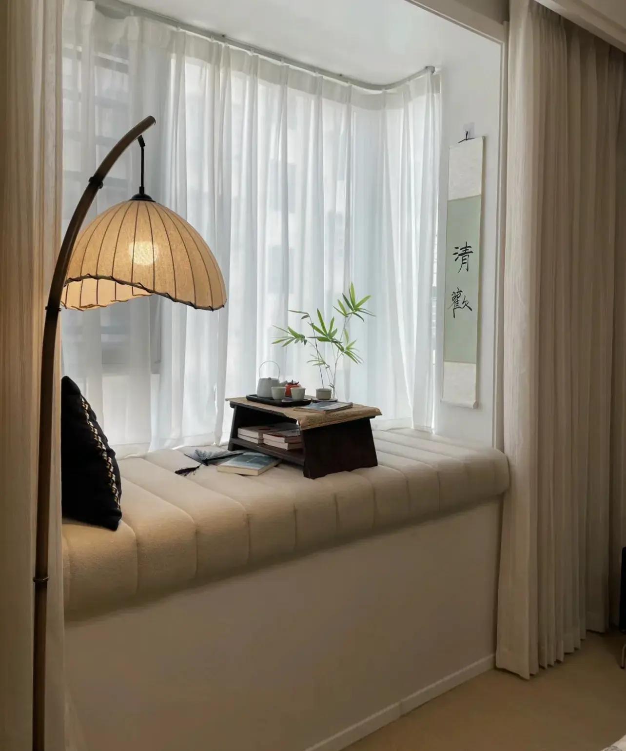 還可以給飄窗墊上,放一個小茶桌,即使沒幾次真正喝茶,起碼看着也賞心悅目。