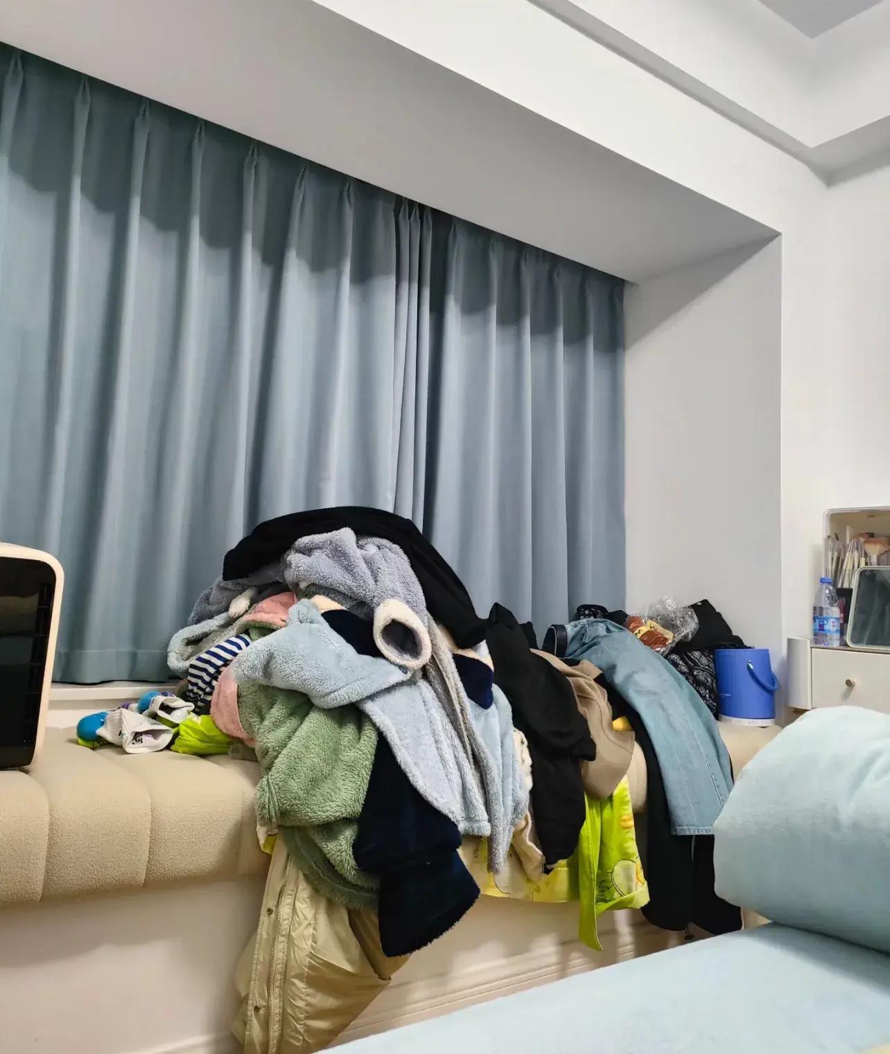 直接把它當做一個衣服堆放區!不求整潔精緻,但求順手隨心、順應天命。畢竟堆衣服是飄窗宿命般的功能,大多時候掙扎得了一時,但改變不了結局!