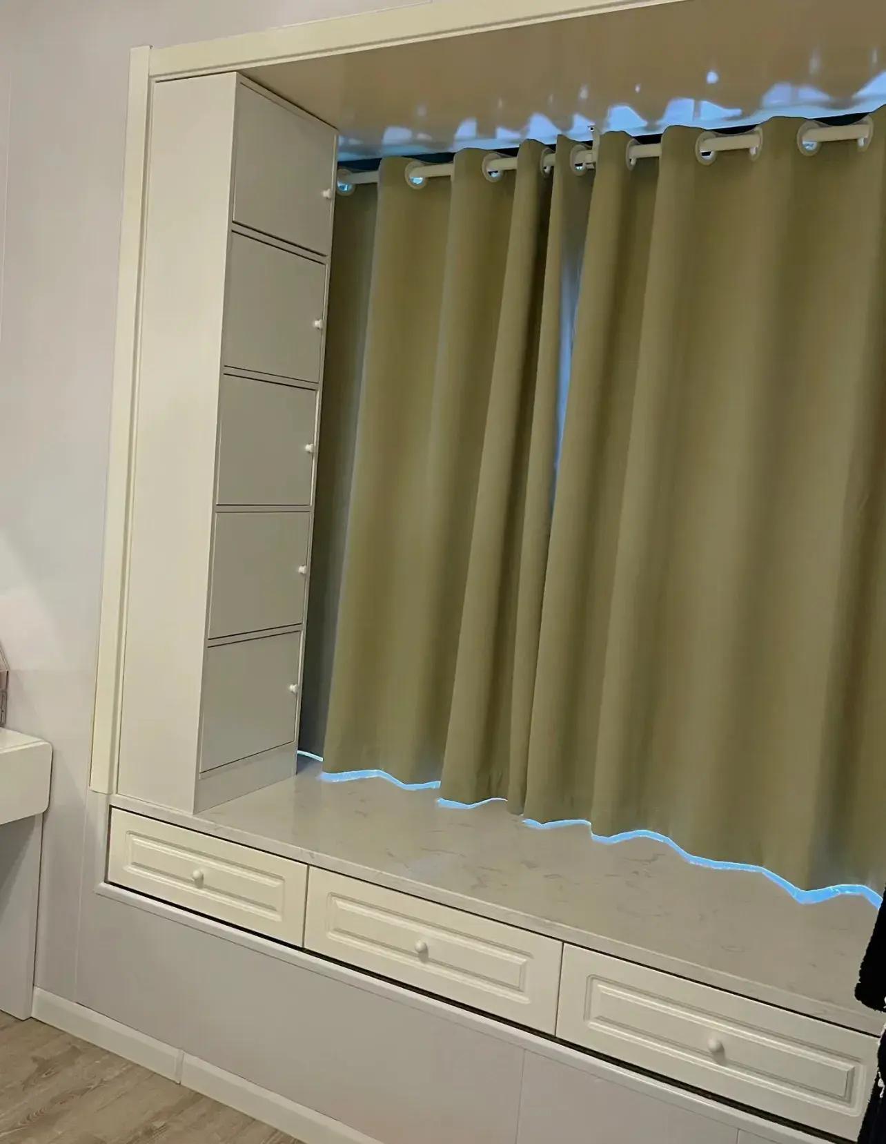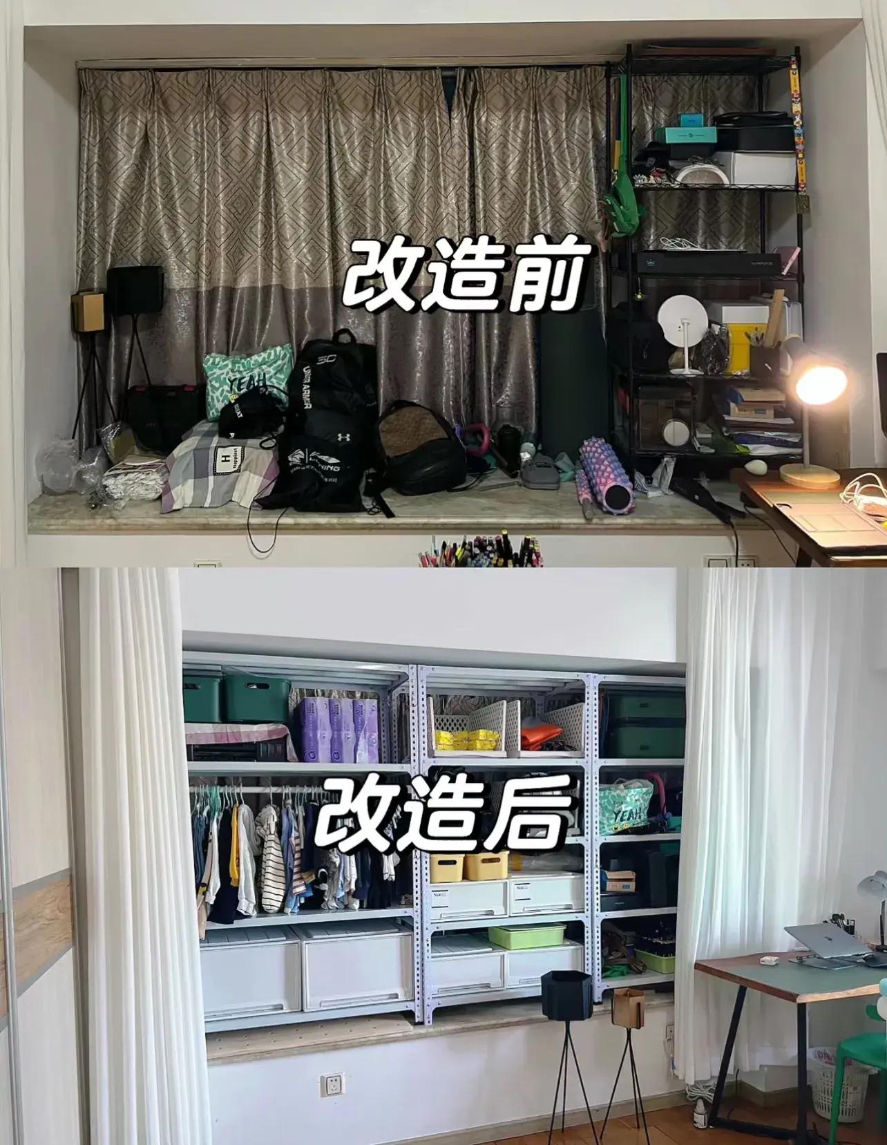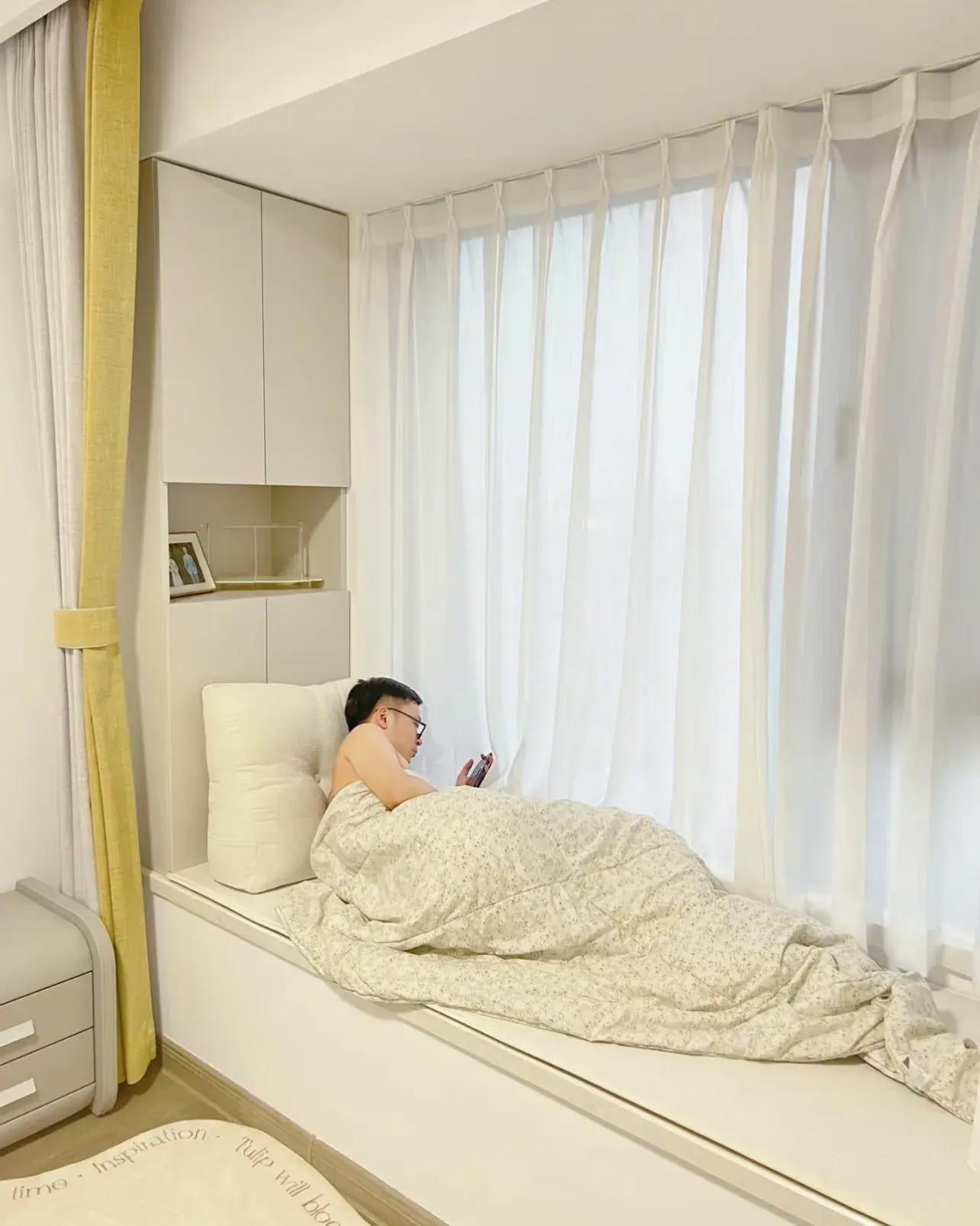 這個家,也不知道爲何,它家的臥室有兩個窗戶,而這個窗戶採光也不好,所以屋主就索性,直接把飄窗朝着衣櫃的方向去改造了!