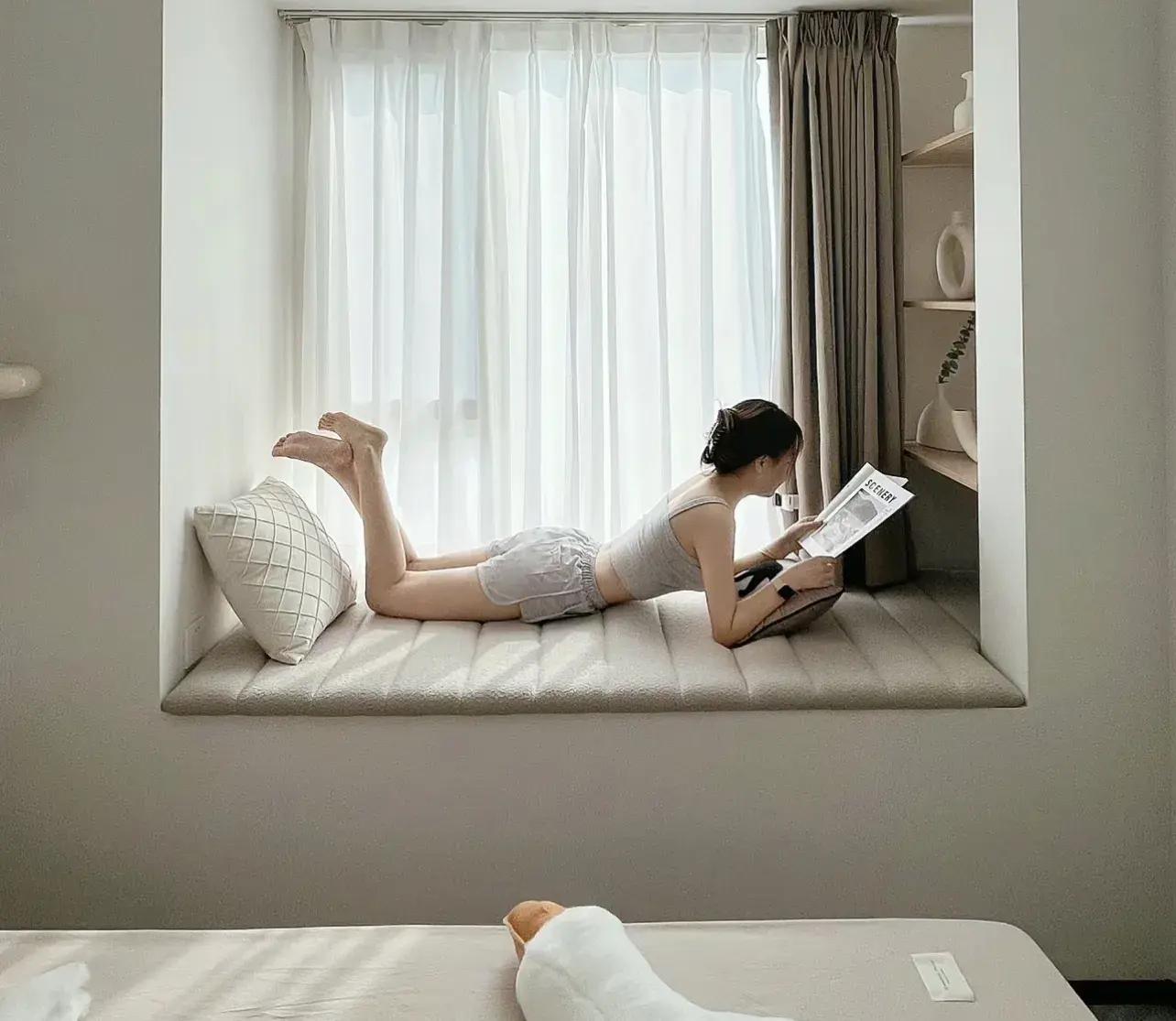 如果用木地板當作飄窗臺面,甚至都可以不用買飄窗墊,直接往上躺坐!