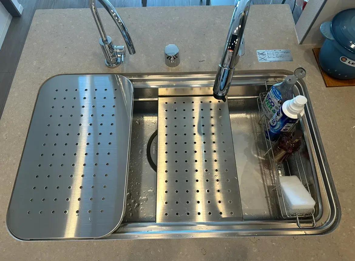 還有水槽本身有洗菜盆配件的,加一片它,洗菜、瀝水的功能都有了。