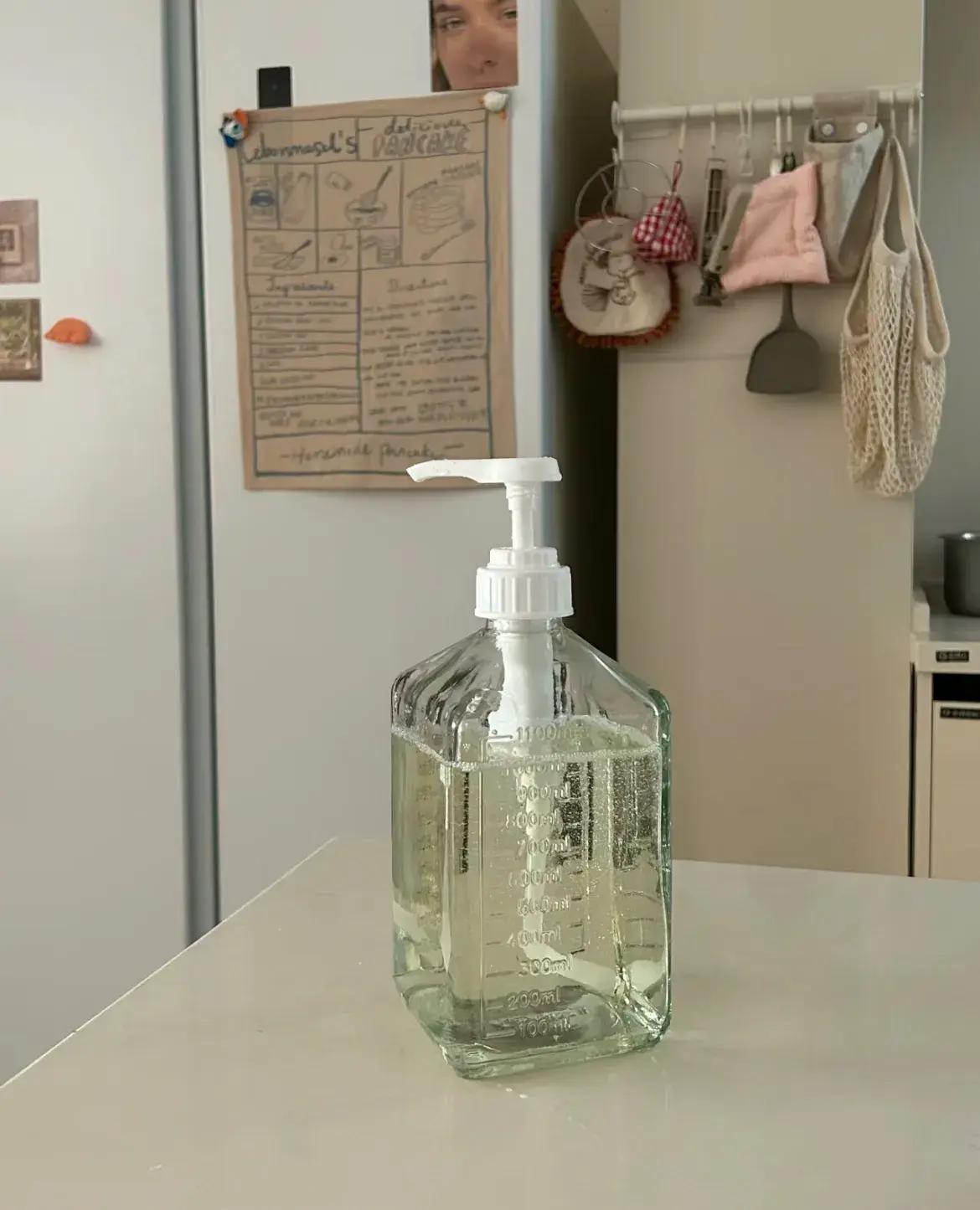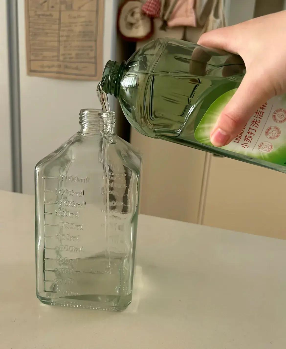 把洗潔精罐進去,透明的玻璃瓶配上透明的洗潔精液體,顯得乾淨又舒適。