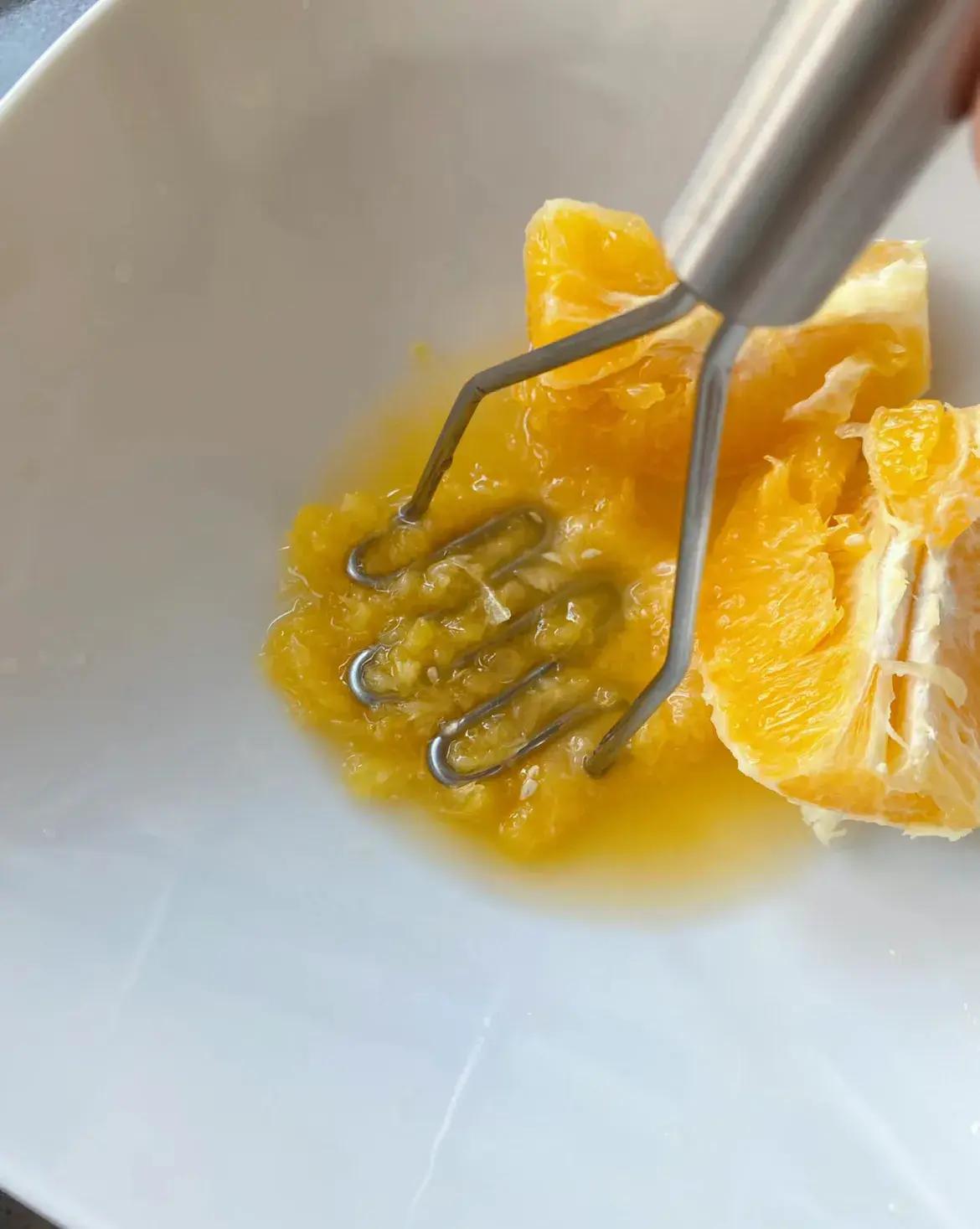 如下圖,橙子可以直接壓成汁,相比那種家用網狀搗碎器,它搗的更徹底,搗完也不掛壁,水一衝就乾淨,因爲奶茶店得追求簡單、快速。