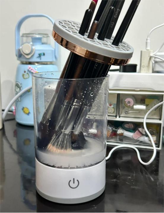 化妝桌上的清潔踩雷用品之一 - 美妝刷清潔機,工作原理就是圓筒內部有個電動旋轉的葉片,帶動水流沖洗刷子。