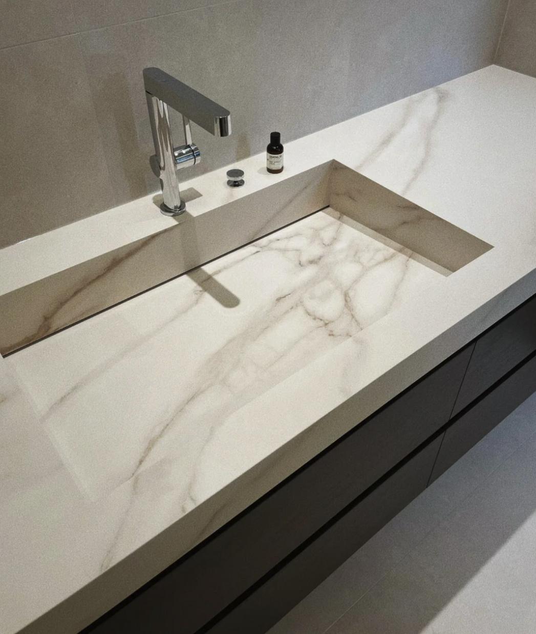 讓整個洗漱臺既擁有巖板帶來的高級感、硬度、耐磨性、抗污性,也做到了整張檯面沒有粘合拼接處,不存在漏水的問題,自然也不必擔心什麼衛生死角。