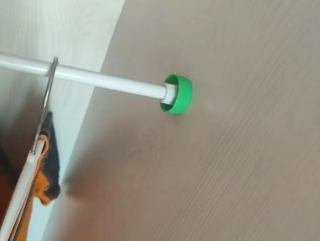 把瓶蓋用免釘膠,粘在伸縮杆的兩頭位置,這樣即使伸縮杆沒卡緊,它也不會掉落!