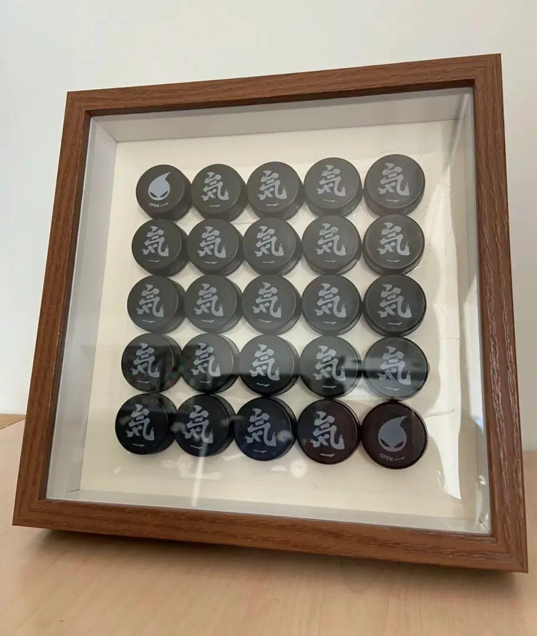 收集到的好看瓶蓋,用膠水粘在背景板上,再做成相框展示起來, 美到哭,愛酒人士學起來~