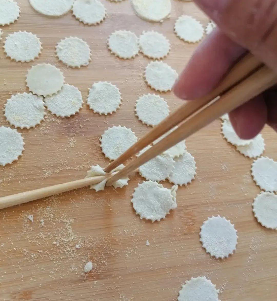 把和好的面擀成餅狀,用啤酒瓶蓋壓好的麪餅