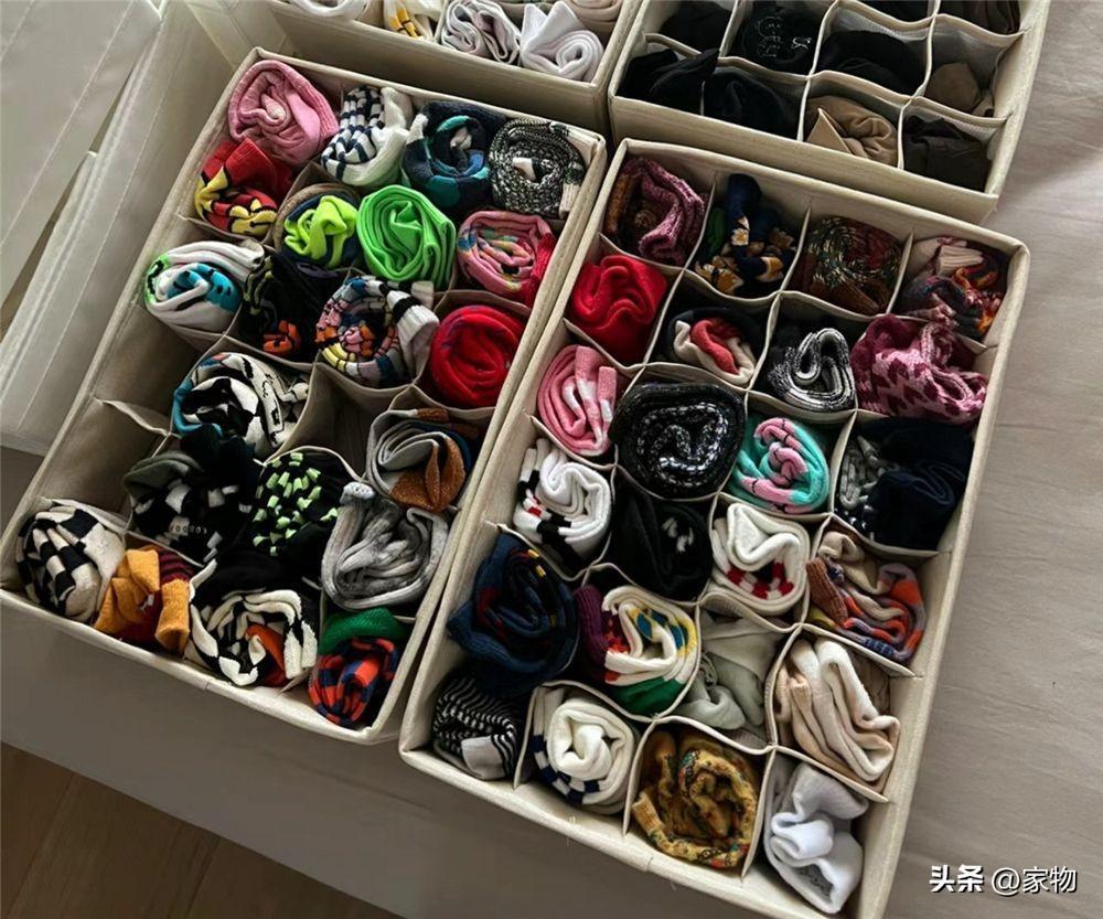 家裏的內衣、襪子,也都有專門的收納盒,或者是收納格,用一個衣櫃抽屜做分隔後,可以輕鬆塞下這些衣襪子和內衣,同樣不用疊放收納,日常家務活兒輕鬆了太多。