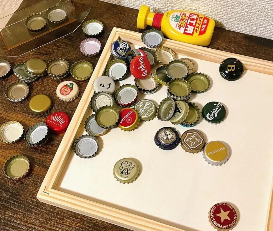 收集到的好看瓶蓋,用膠水粘在背景板上,再做成相框展示起來, 美到哭,愛酒人士學起來~