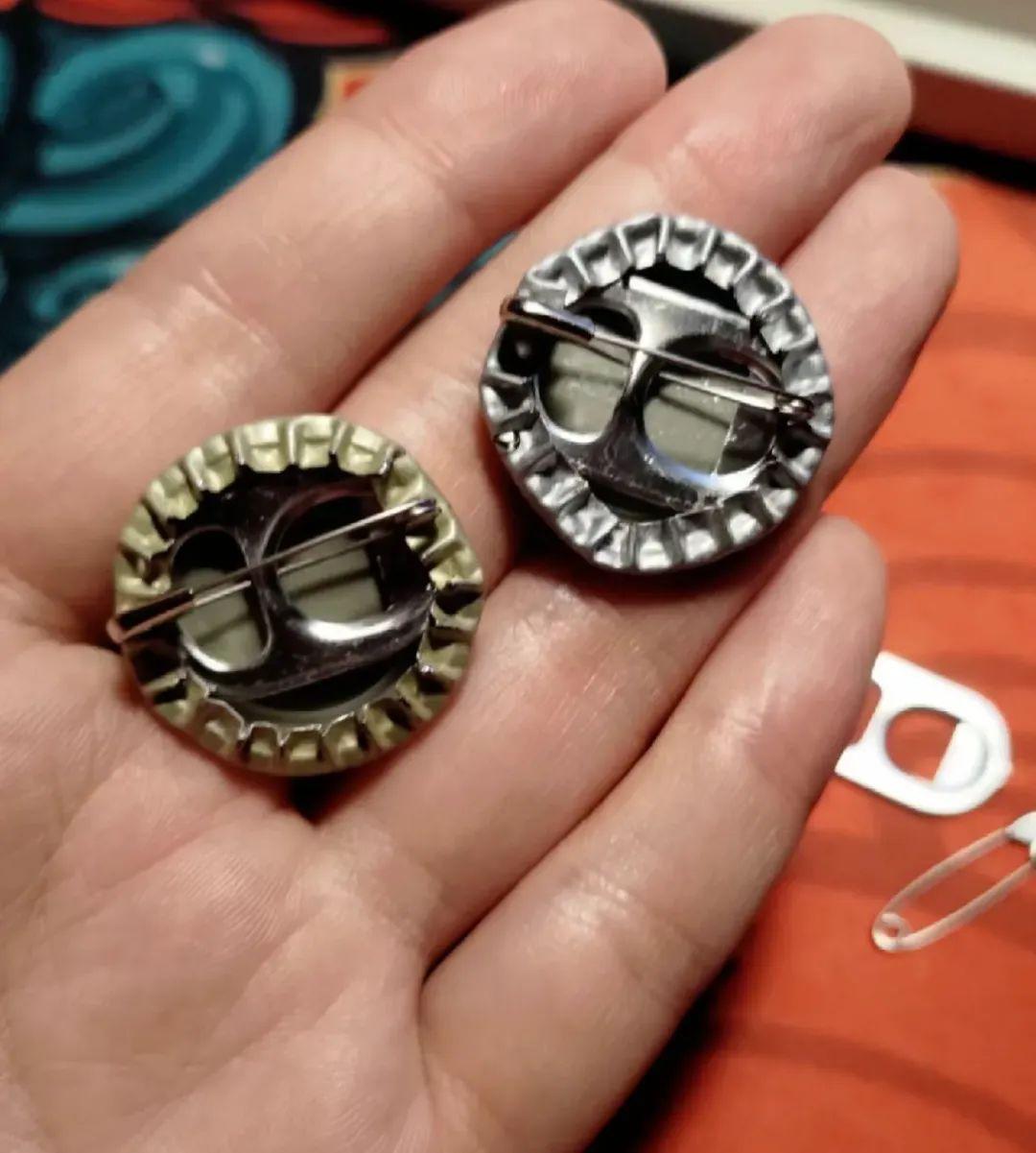 將易拉罐拉環嵌在啤酒瓶蓋裏,向下壓緊側面花邊,將別針從拉環中間穿過,這樣你就有一個小徽章了!