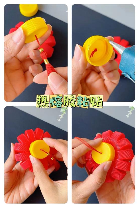 先按自己想要的燈籠大小,把氣球打好,然後瓶蓋和瓶蓋之間用熱熔膠槍固定住,最後把氣球戳破就好!效果如下: