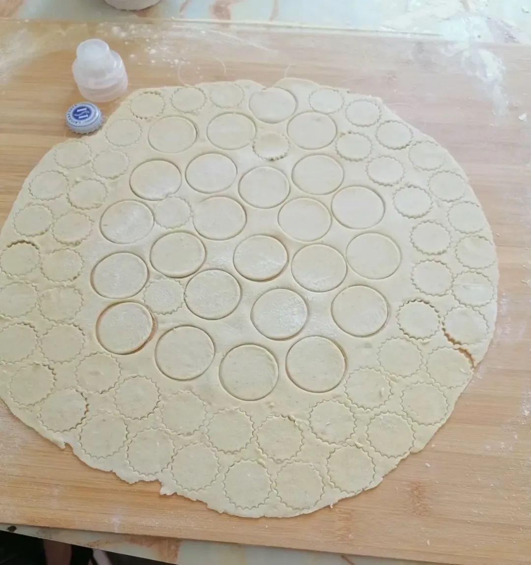把和好的面擀成餅狀,用啤酒瓶蓋壓好的麪餅