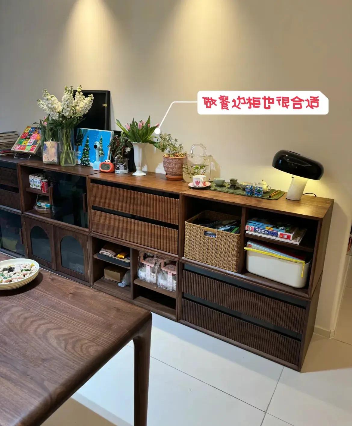 還有餐邊櫃,各種模塊化組件的櫃子,靈活度高、氛圍感也更好,只要黃金利用區佈局得當,高處的一點空間用不用也不差那麼一點。