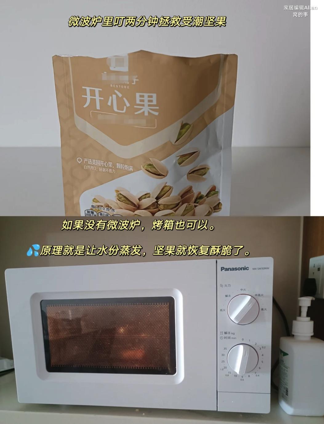 其實家裏如果有微波爐,或烤箱的話,可以把受潮的堅果放在裏面稍微加熱一下,原理也很簡單:就是讓裏面的水分蒸發,然後堅果就又恢復酥脆的口感啦!