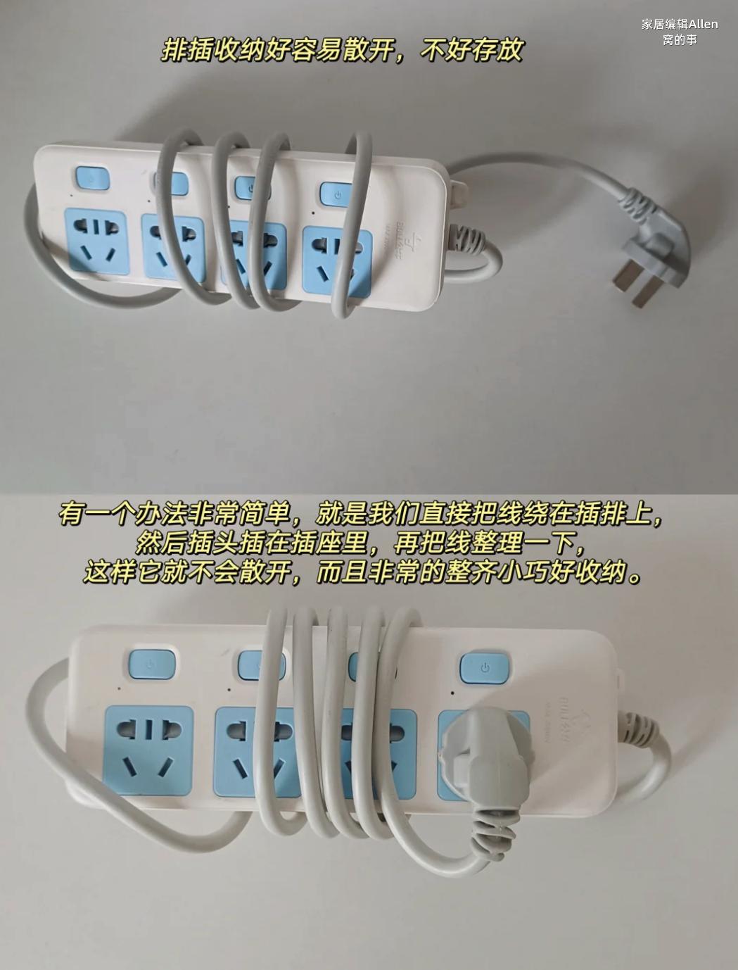 只需要把插排的電線纏繞面板後,再把插頭,插入插孔裏即可完成,關鍵這樣還收納更牢固,不會散開~