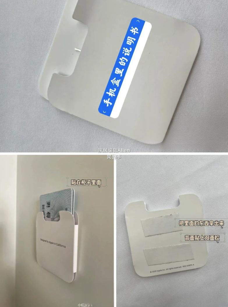 新手機盒子裏的說明書包裝,千萬不要扔了。背後貼上雙面膠,貼在櫃子裏面,用來收納重要卡片,例如身份證之類的,簡直絕了~