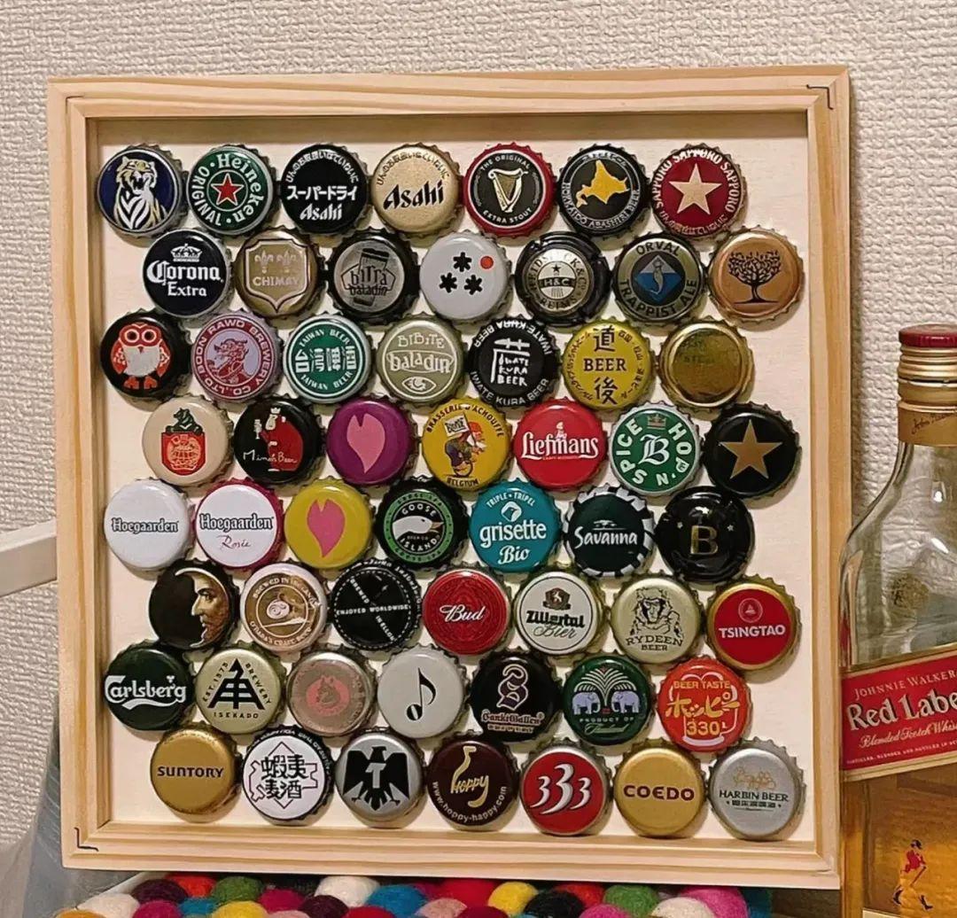 收集到的好看瓶蓋,用膠水粘在背景板上,再做成相框展示起來, 美到哭,愛酒人士學起來~