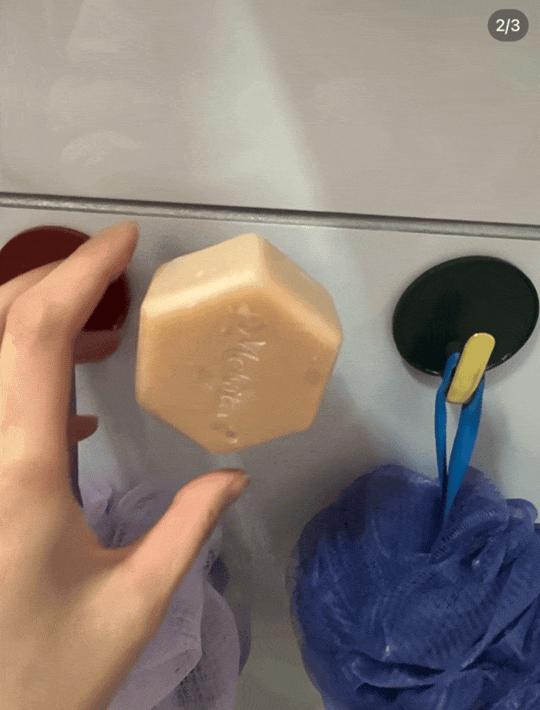 支架貼在牆上,鐵質的玻璃瓶蓋懟進肥皂裏,磁吸上牆,用時取下,不用擔心肥皂掉落,磁力完全夠。