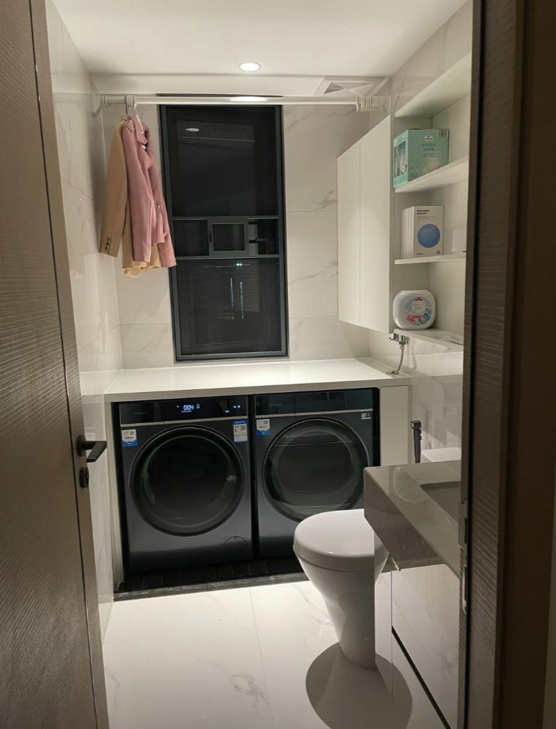 我單獨買了一臺烘乾機,因爲南方到了梅雨季,衣服曬在陽臺也根本曬不幹。所以烘乾機真的很需要,而且洗衣房設置主衛最好,既節約了寶貴的陽臺面積,而且洗衣機上方也設置了掛衣區,因爲這個窗戶的通風特別好,那像有些衣物是不能暴曬,也不能烘乾的(會掉色縮水),就可以掛在主衛陰乾。