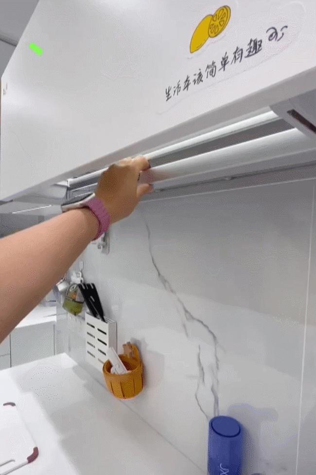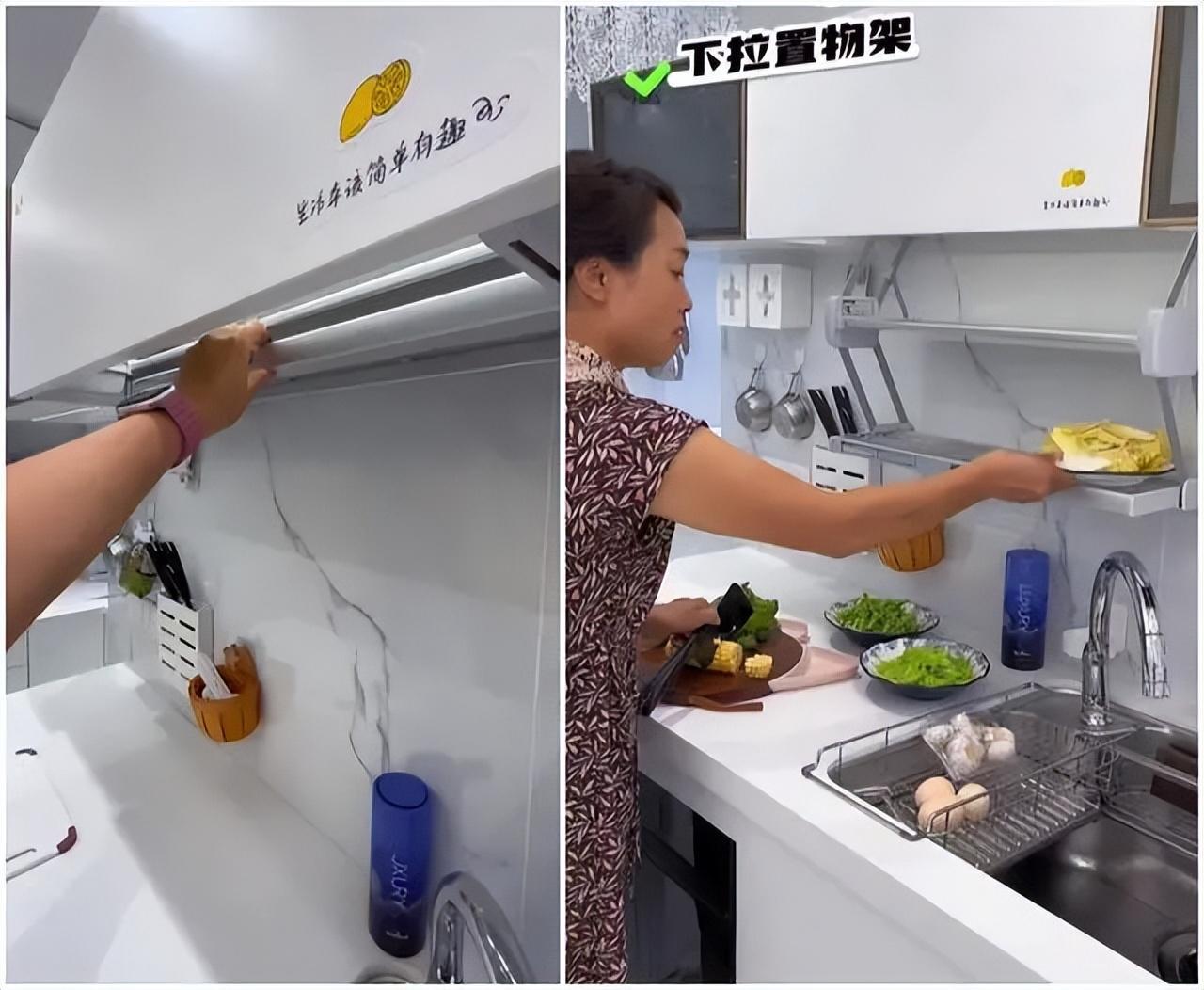 家裏是128㎡的房子,但廚房確實不夠大,而且都是承重牆也沒辦法擴大,就造成了櫥櫃檯面的空間有限。尤其切菜區的空間很小,我是沒法忍受的,所以才決定給吊櫃下面裝了這個“下拉置物架”。
