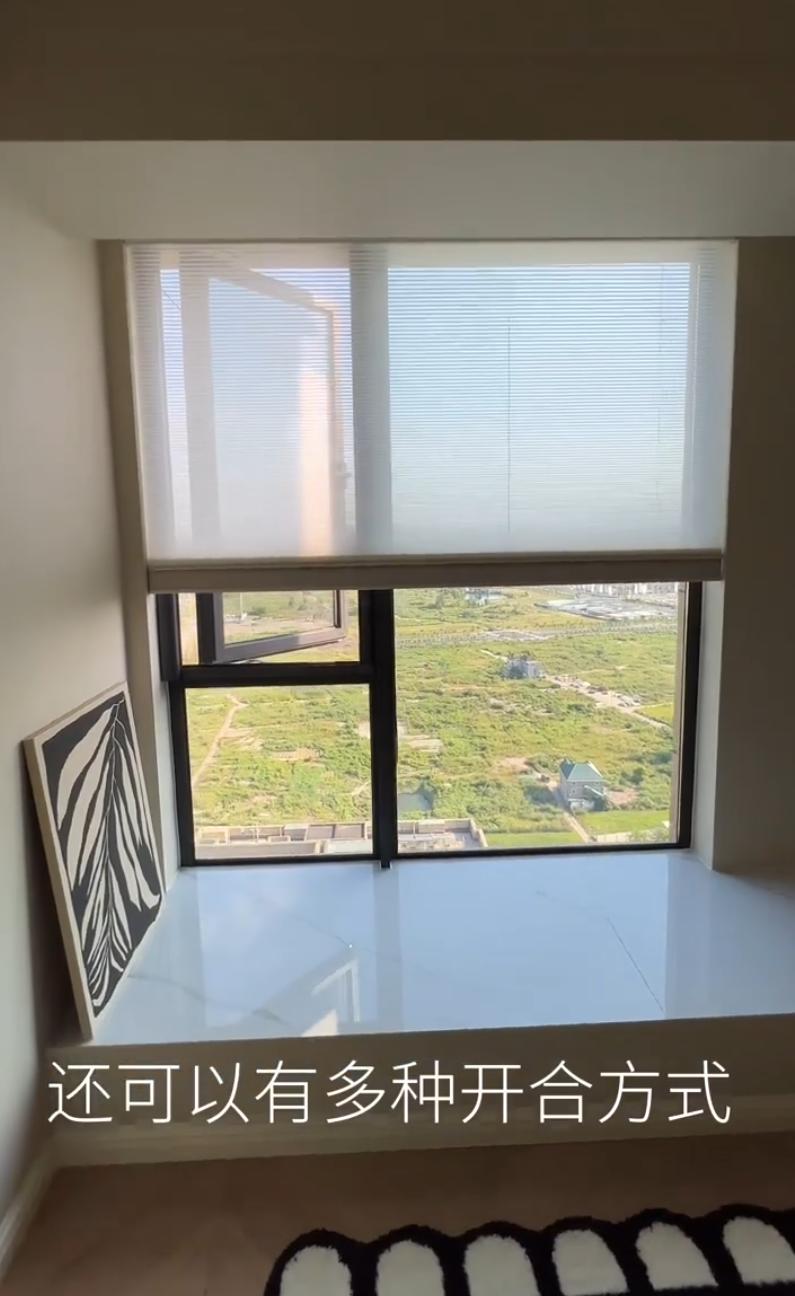而且它的開合方式也有很多種,可以全開,可以半開懸停,也可以像下圖一樣,窗簾和遮光簾組合開,模式特別多,操作性很強。