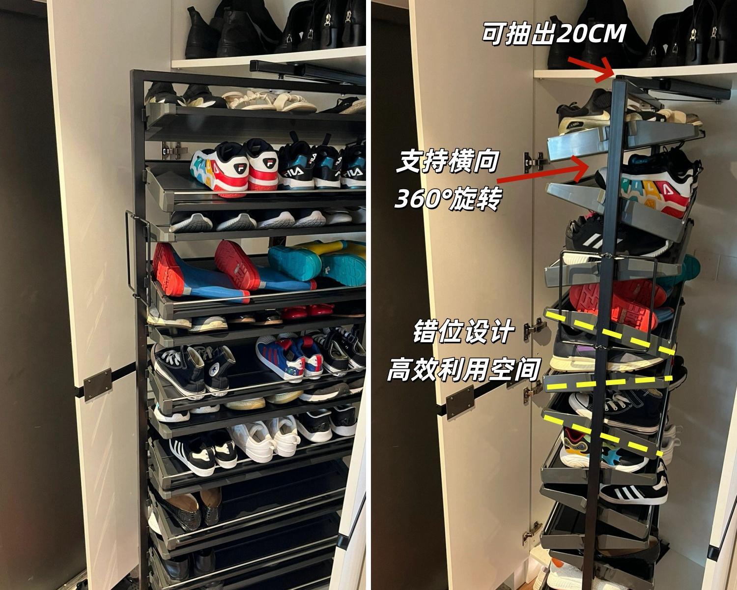 當然最重要的不僅是節省空間,它還可向外抽出20cm,並支持橫向360°的旋轉,這樣無論是找鞋子,存取,還是清潔架子衛生都特別的方便,真的超級好用。