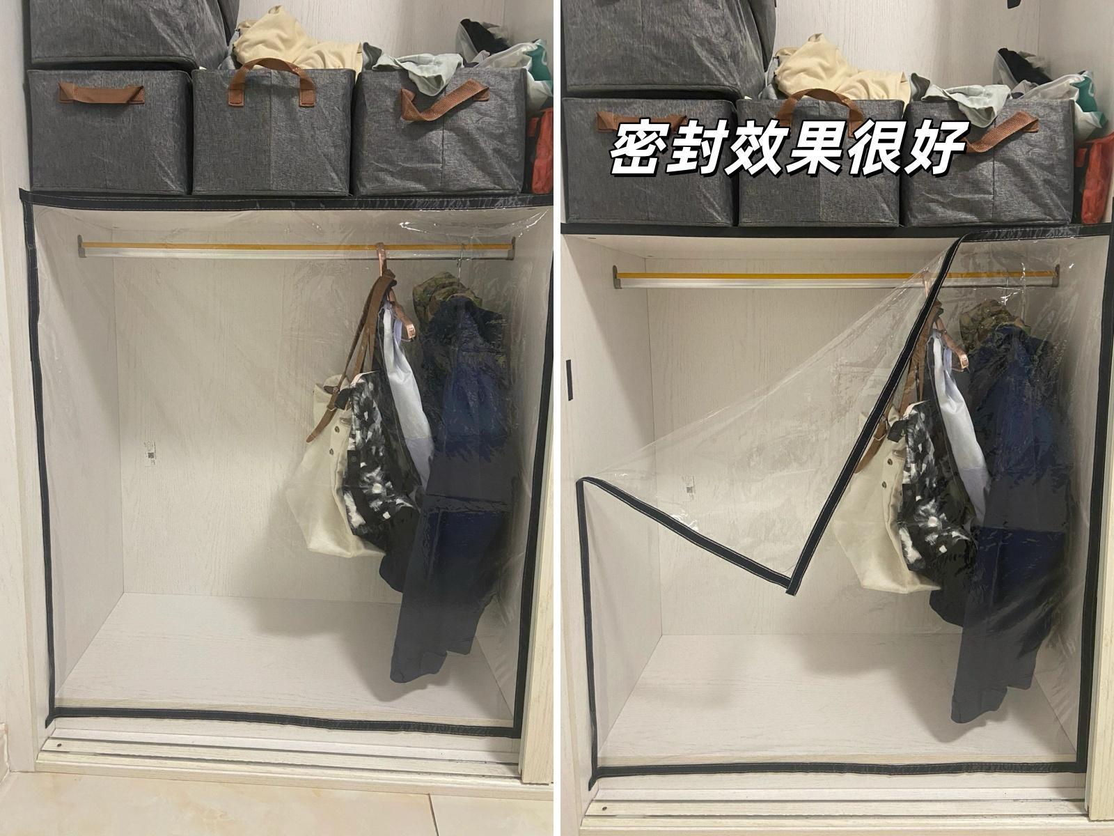 它直接按照衣櫃的尺寸定做了一個,是磁吸款,把軟磁鐵貼上衣櫃一圈,透明膜四周也帶有軟磁鐵,一吸附就能安裝上了,密封效果很好。這樣就不怕櫃門有縫隙導致衣櫃內部落灰了,既防塵,還能起到一定的防潮作用,因爲是磁吸的,所以存取衣服開關也很方便。