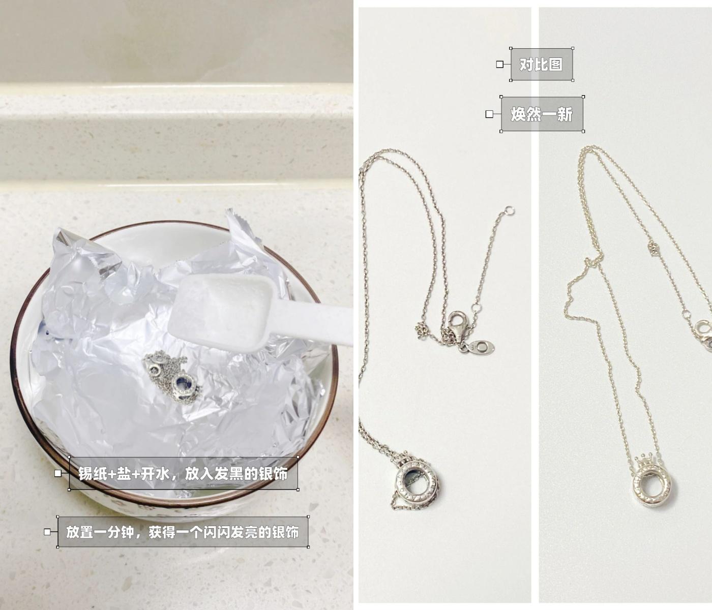 第二招是用來還原氧化發黑的銀飾,如上圖這般操作,錫紙+鹽+開水混合後浸泡發黑的銀飾,一分鐘後就能恢復閃亮了。