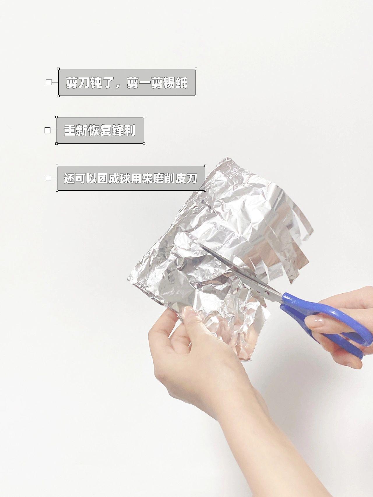第五招,變鈍的剪刀恢復鋒利,用剪刀在錫紙上剪一剪,剪刀就能變鋒利不少。而且剩下的錫紙也不用浪費,攢成團還可以用來磨一磨削皮刀。
