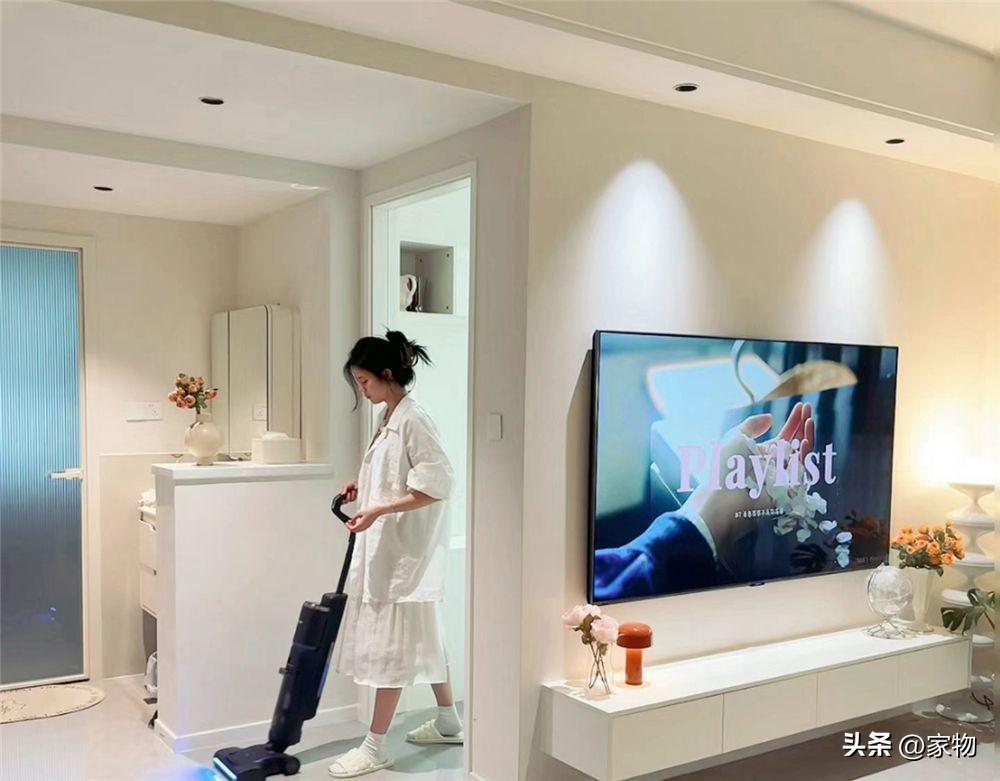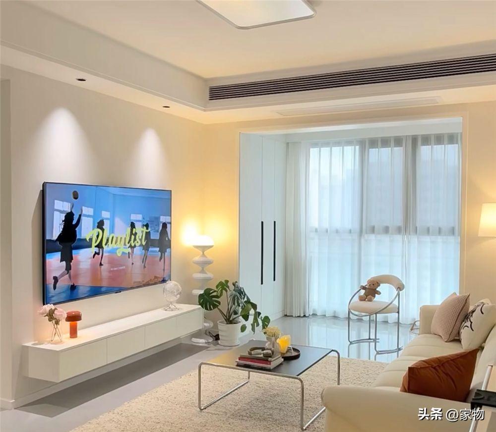 對面電視牆也是以簡單精緻爲主,懸空電視櫃、壁掛電視,旁邊放上簡單的氛圍燈裝飾,爲了避免乳膠漆刷牆太過單調,她選擇用綠植、擺件和射燈來點綴,只能說是恰到好處。