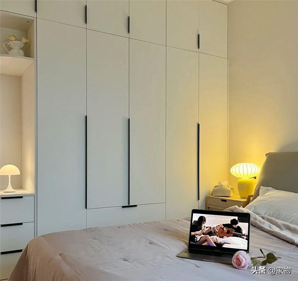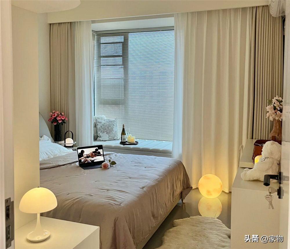 最後說說家裏的主臥室吧,這間主臥室內真的是充滿了溫馨感,雖說,臥室內空間不算大,擺上雙人大牀、裝上衣櫃以後就沒有太多的剩餘空間,但不得不說,暖色的燈光、牀品、窗簾,都給它增添了一抹慵懶質感。