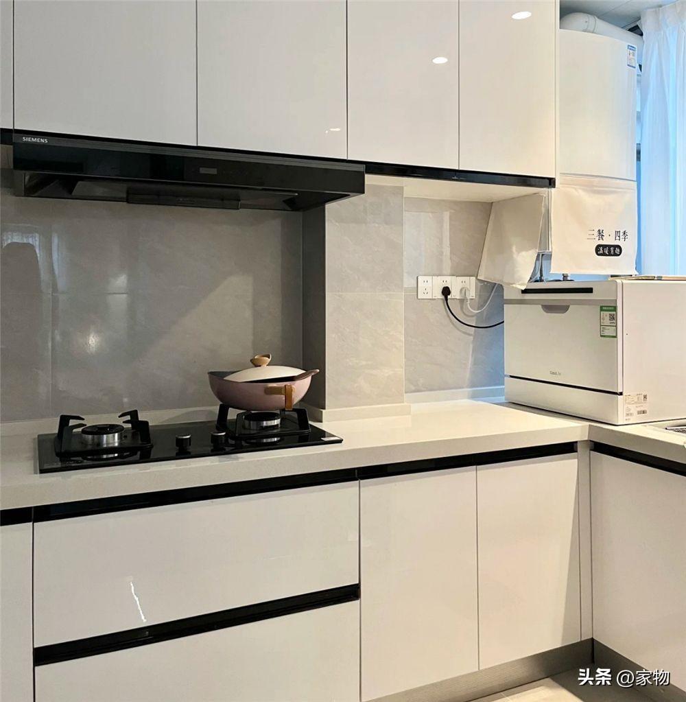 廚房內做L形櫥櫃後,吊櫃、底櫃相互搭配,將亂七八糟的碗碟餐具統統藏入其中,檯面幾乎保持一種空空蕩蕩的狀態,從這種整潔乾淨的狀態,也能看出這位湖北女子生活的講究。