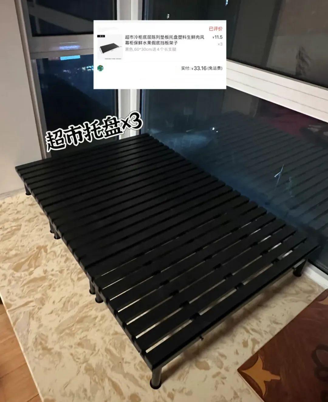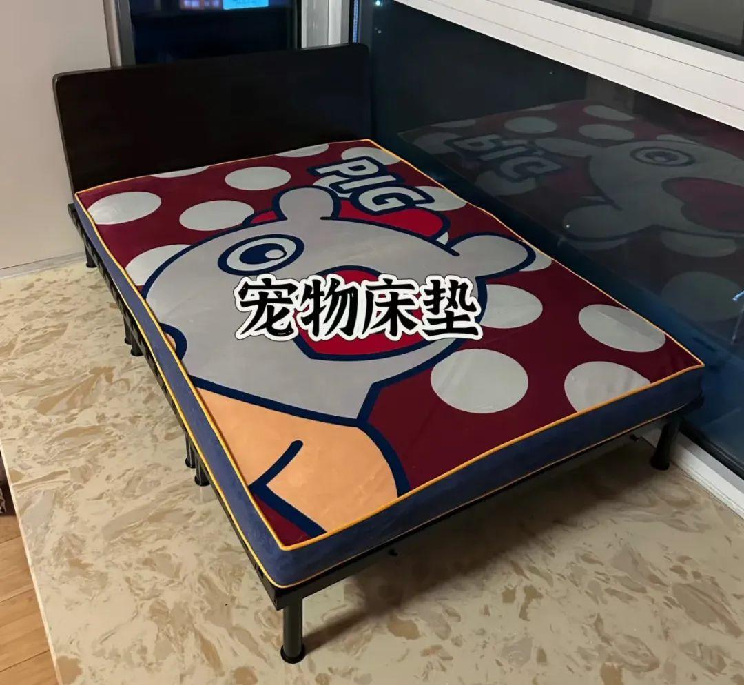 另外買了個置物架,側放當牀頭,三塊物流墊板一拼,外加一個同尺寸的寵物牀墊。