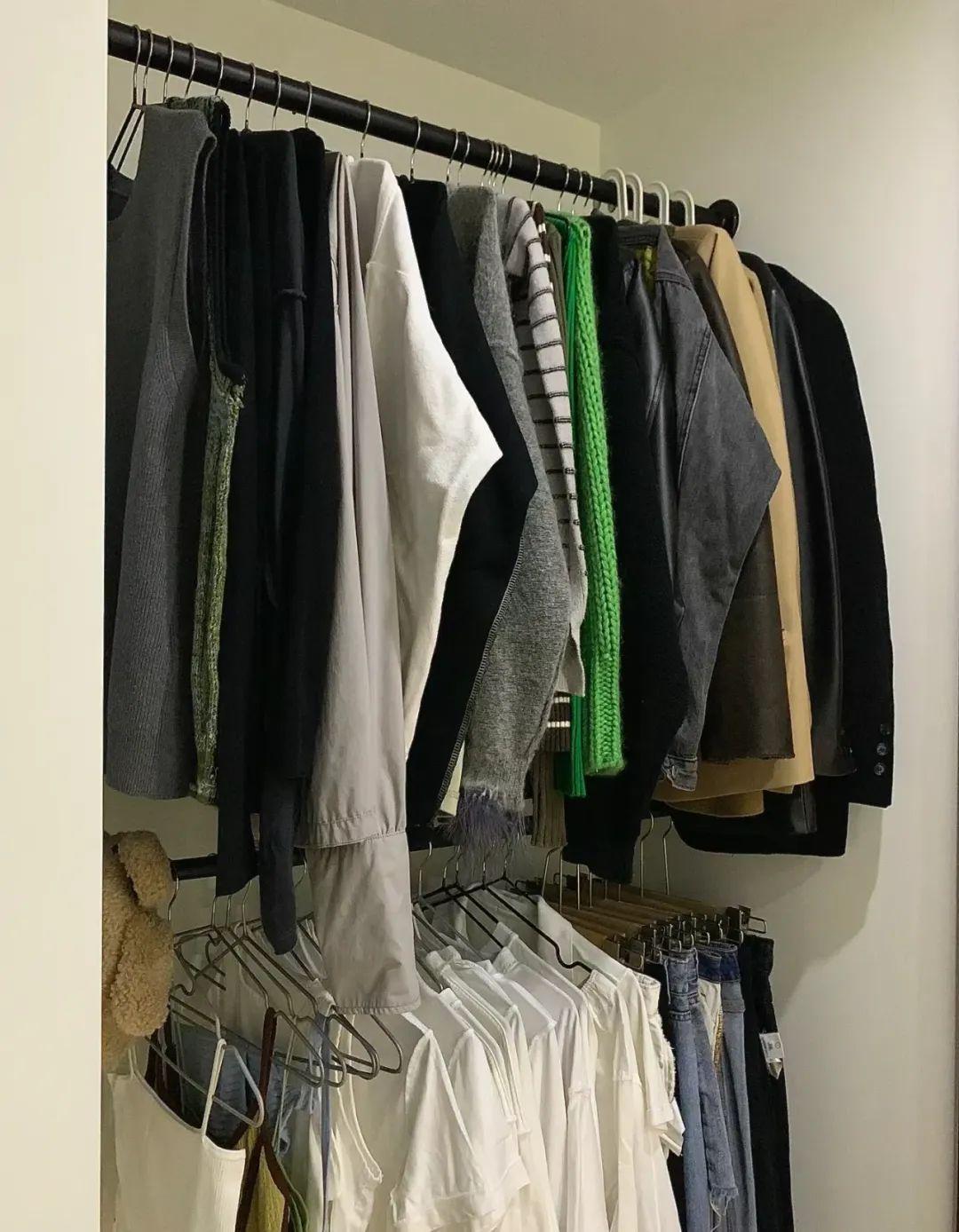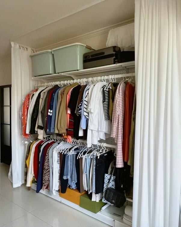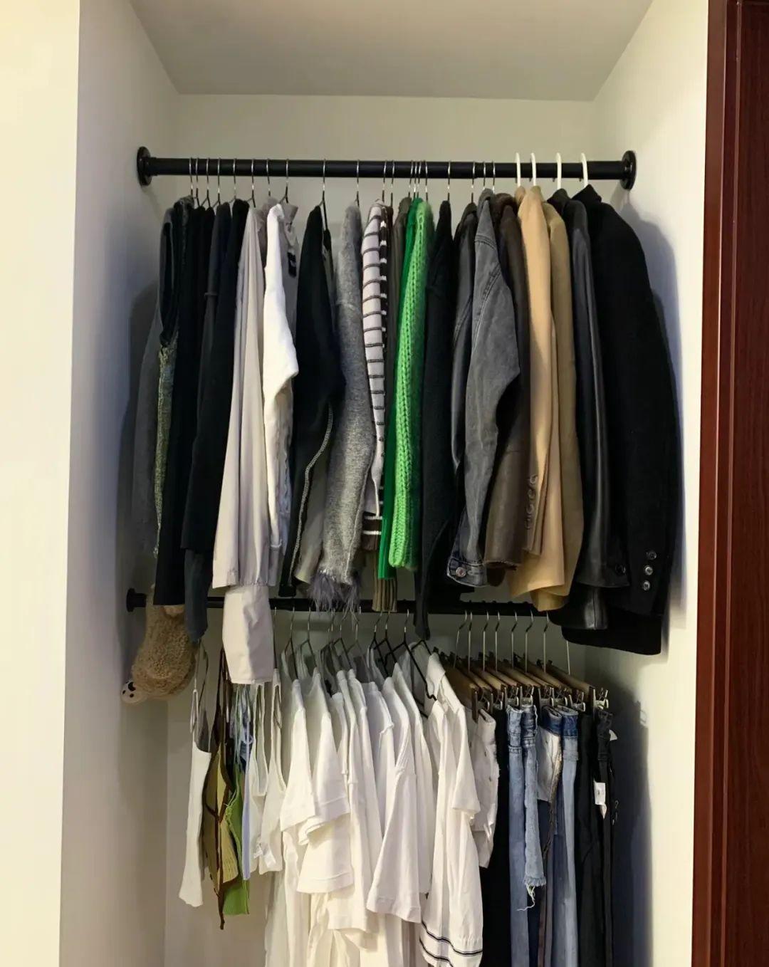 還可以根據自己的需求,去定製衣櫃的結構,裝兩條長懸掛杆就可以實現衣帽間自由~ 怕衣服落灰的,可以在外面用伸縮杆拉一圈布簾。