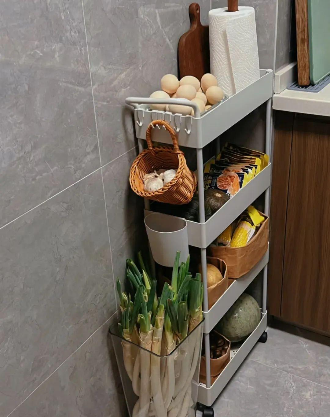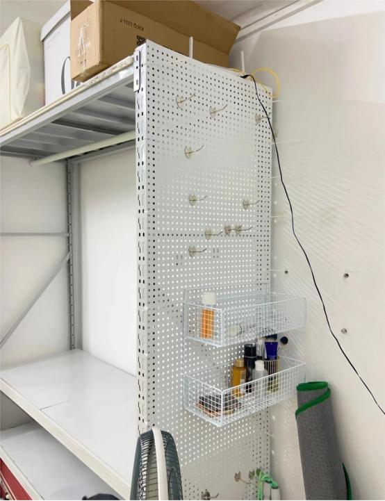 側面還可以配上洞洞板,多搞幾個掛鉤,掛衣服,包包,還有置物籃,放生活用品,超級方便。