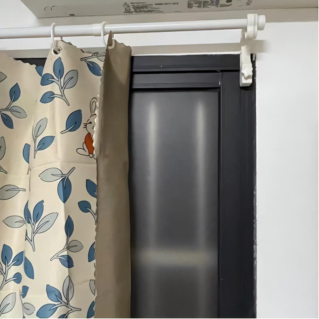 它構造簡單,不需要打孔安裝,只要鐵片壓在窗框的背面,正面用螺絲固定卡扣,在窗戶兩側各裝一個,配根伸縮杆就能掛窗簾了。