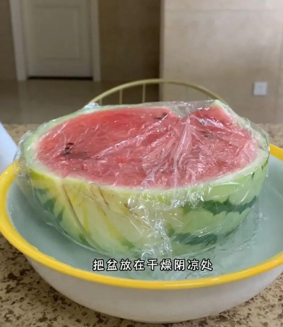 給很多腸胃弱不能喫冰鎮西瓜的,或者在室外沒有冰箱可用uu們,分享一個老瓜農自用的保鮮/冷藏土方法,打一盆水,把西瓜蓋住保鮮膜放進去,注意保鮮膜邊沿要浸沒在水裏,這樣一定程度可以隔絕空氣,延長保鮮效果。