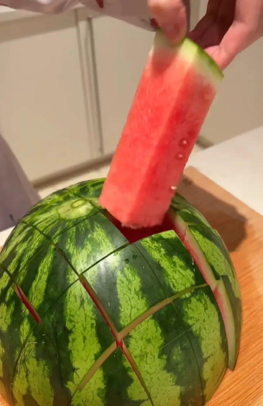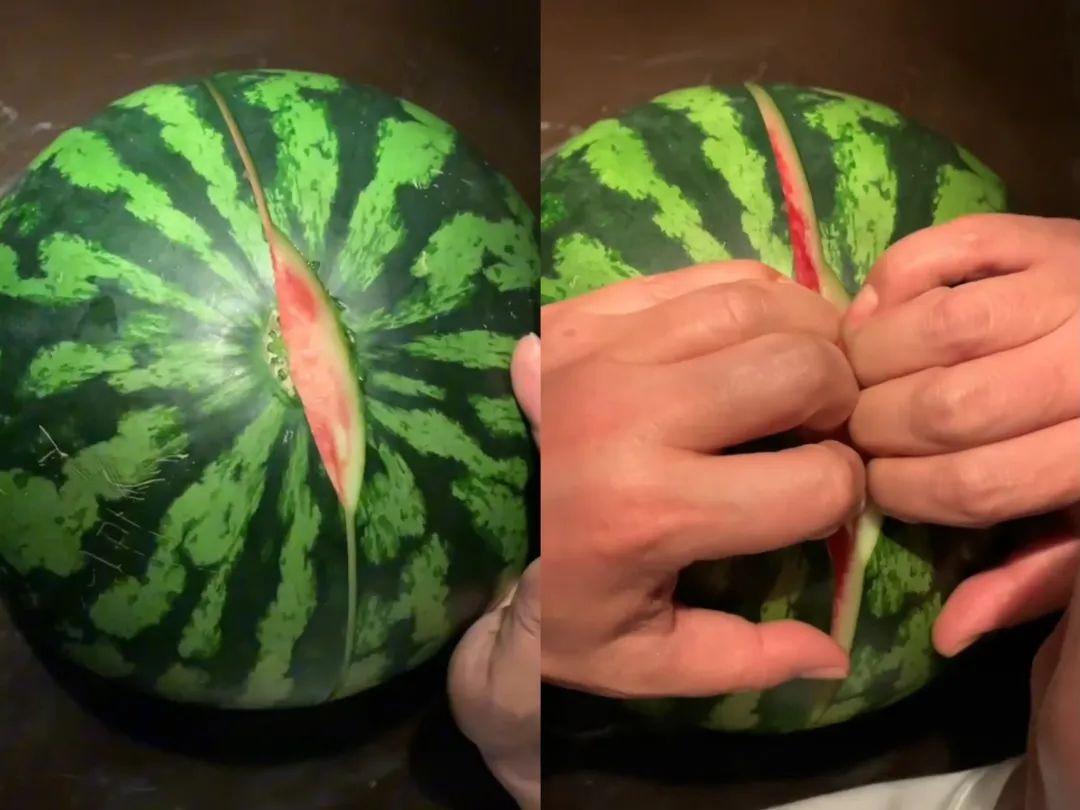 可以先用倒劃拉開口子,然後用手掰開。這也是爲啥總覺得超市的西瓜更新鮮的原因。