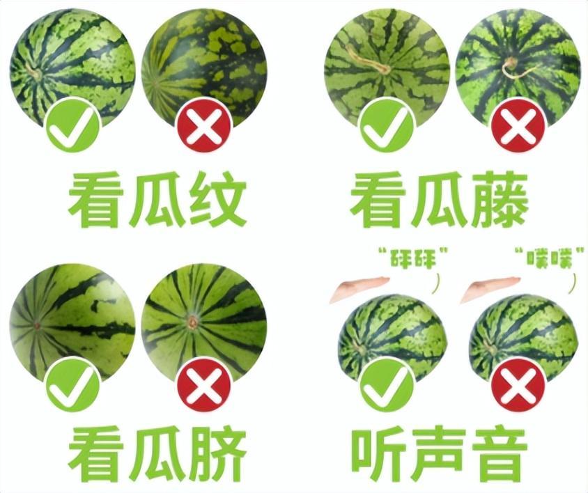 網上流傳了一堆挑瓜方法,比如上圖,看瓜紋,看瓜藤,看瓜臍,拍打聽聲音,其實這裏只有一種是真實有效的:看瓜藤。