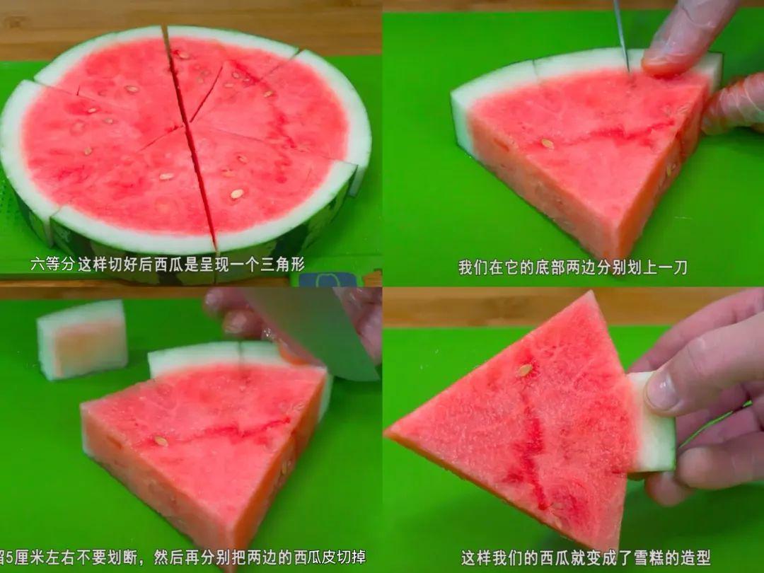 超級可愛的切西瓜方法,將西瓜盤切成六等分,再將底部的西瓜皮分成三等分,切掉兩側的西瓜皮,你將得到一個萌萌噠小雪糕/小聖誕樹造型的西瓜塊,不敢想象這個在幼兒園將掀起怎樣的熱度。