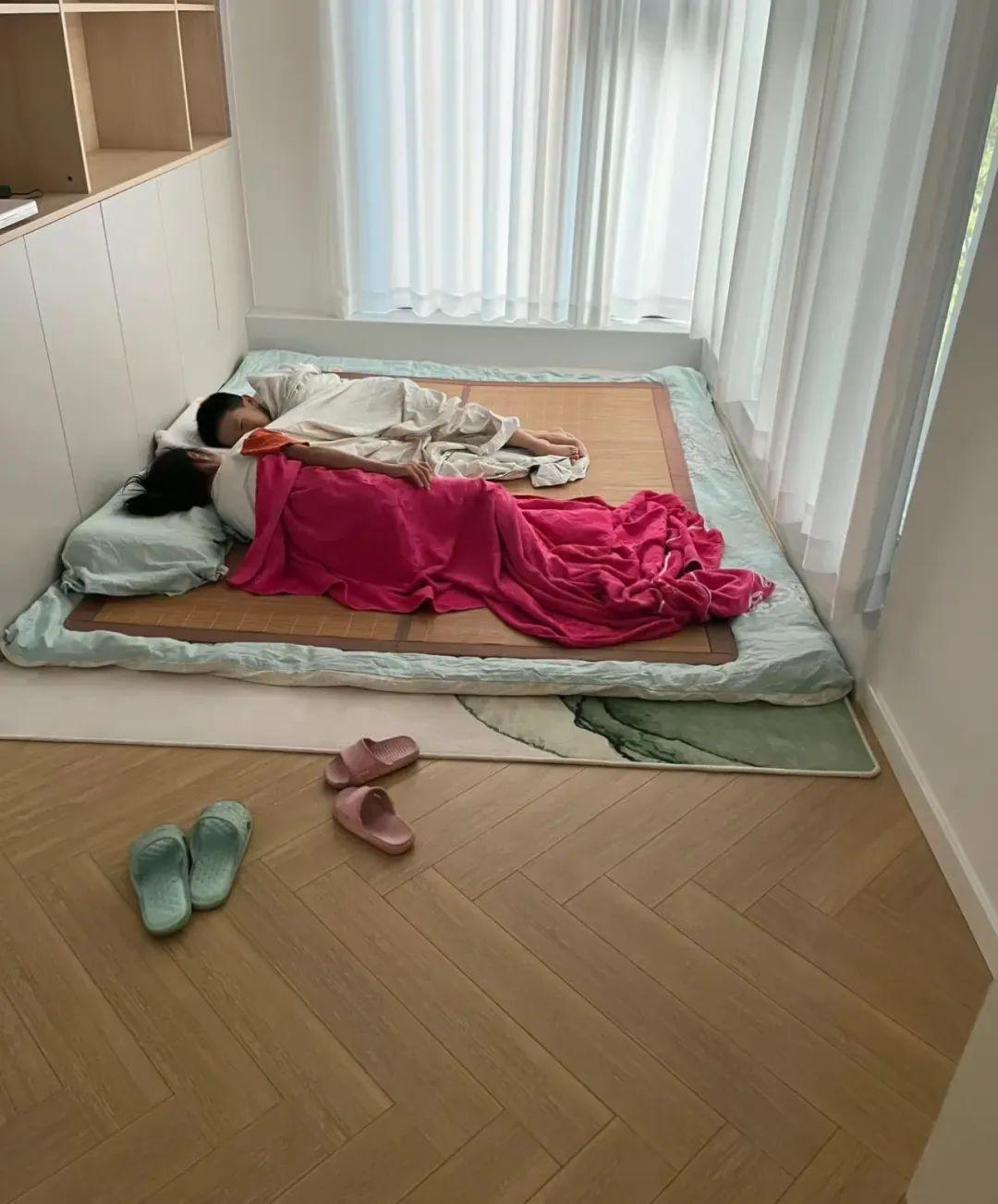 大道至簡,嫌地板硬的話,可以用幾張軟墊一鋪,也是一張牀。白天把被子一收,又多出來一個多功能區。