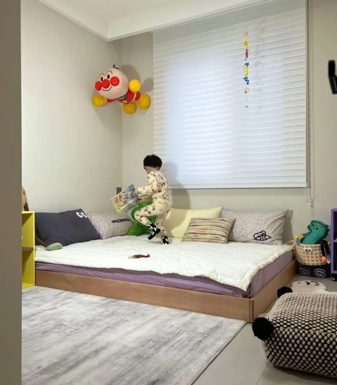 牀邊鋪個厚地毯,孩子的遊樂空間又擴大了,只有20cm高的牀架,即使沒有圍欄,也不怕小孩摔傷。