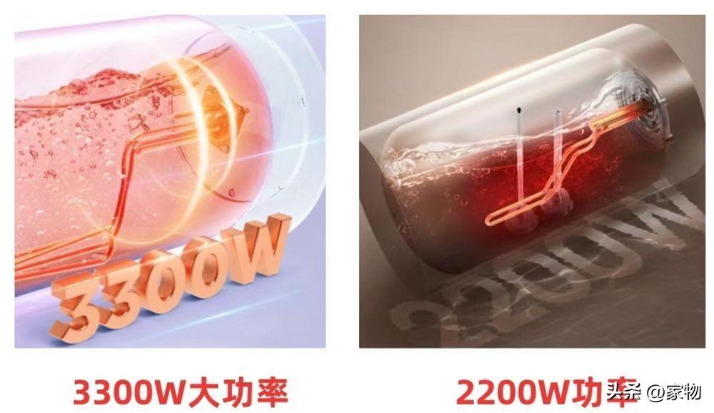 除了剛纔說的雙膽加熱,影響電熱水器加熱效率的主要是功率,3300W的功率,加熱效率很高,加熱速度很快,2200W雖然瞬時看起來省電,但所需的加熱時間更長,個人感覺功率偏高一些爲好。