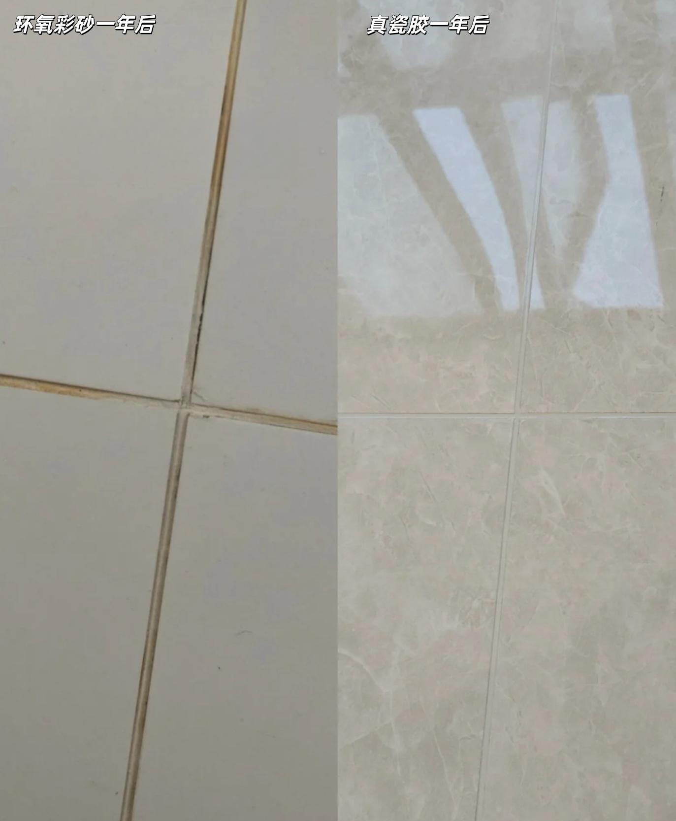 瞧瞧這一年後,磚縫都發黑了,因爲環氧彩砂表面是和水泥一樣的材質,油污+灰塵的混合物,非常容易吸附在上面。雖然用重油污清潔劑倒是能擦乾淨,但隔段時間就得蹲下來一條條縫的擦,簡直把人累麻了!