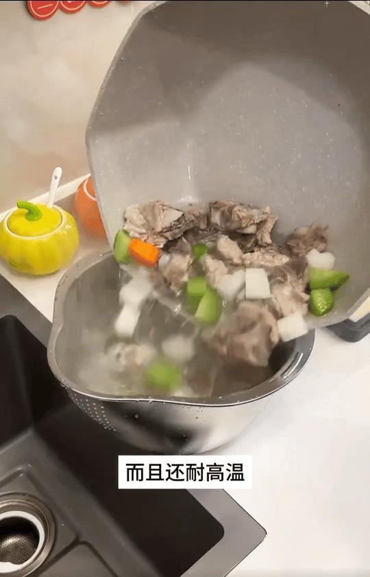 其“不平的底”,就是爲了,你再瀝這種剛撈上的熱肉、剛焯水的菜、需要過水的涼麪時,可以更加遊刃有餘。