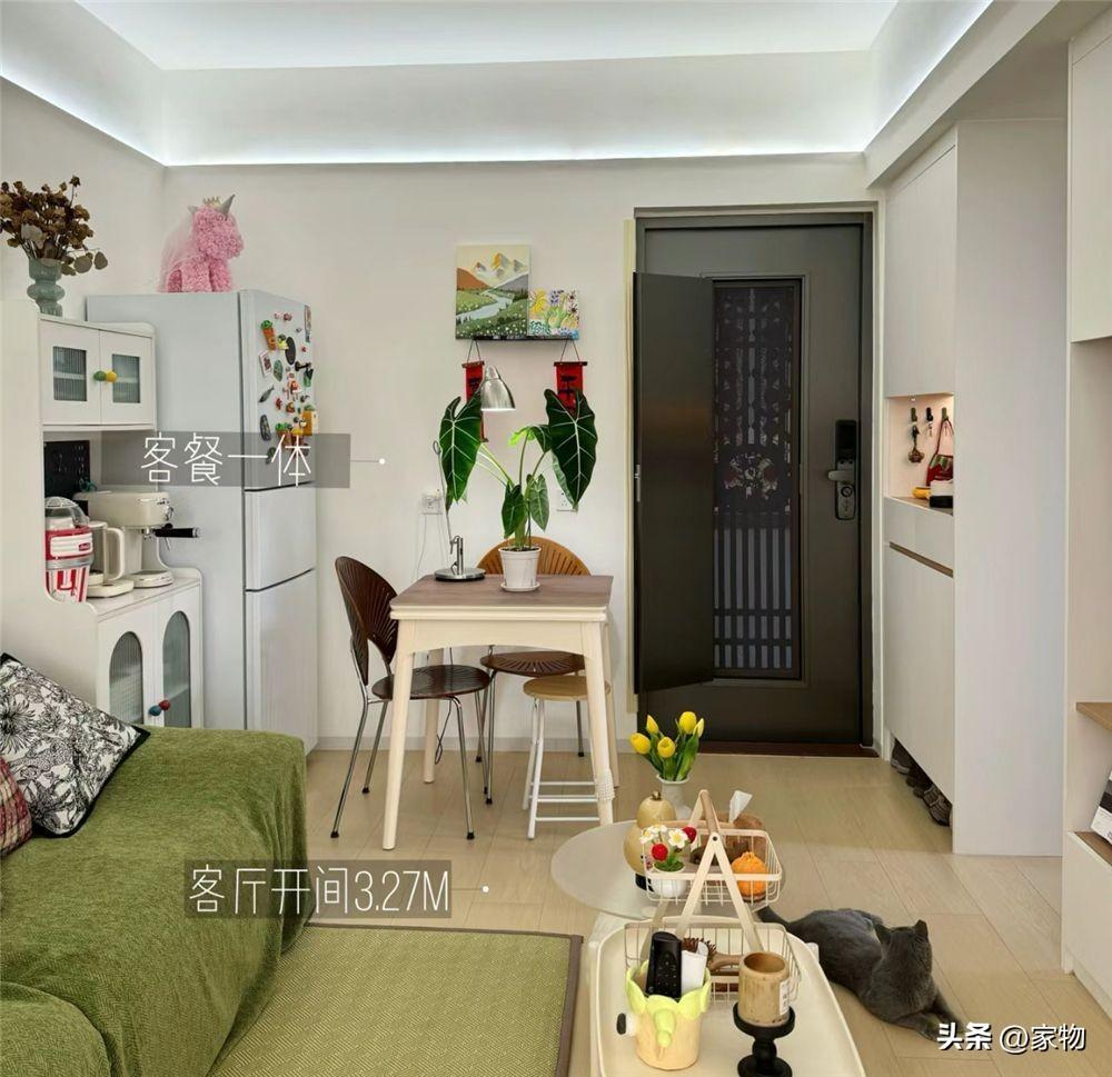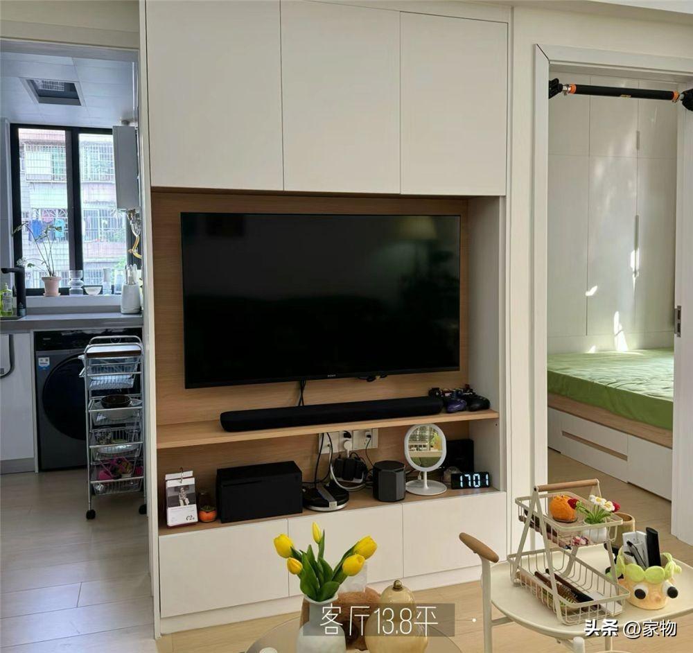 也難怪這位廣州姑娘的35㎡蝸居能火,她對小家的空間佈置真的太到位了,別的不說,面積大概13.8㎡的客廳開間有3.27米,剛好能利用電視牆再做個櫃子,既不影響進出動線,又能留出放小茶几的空間。