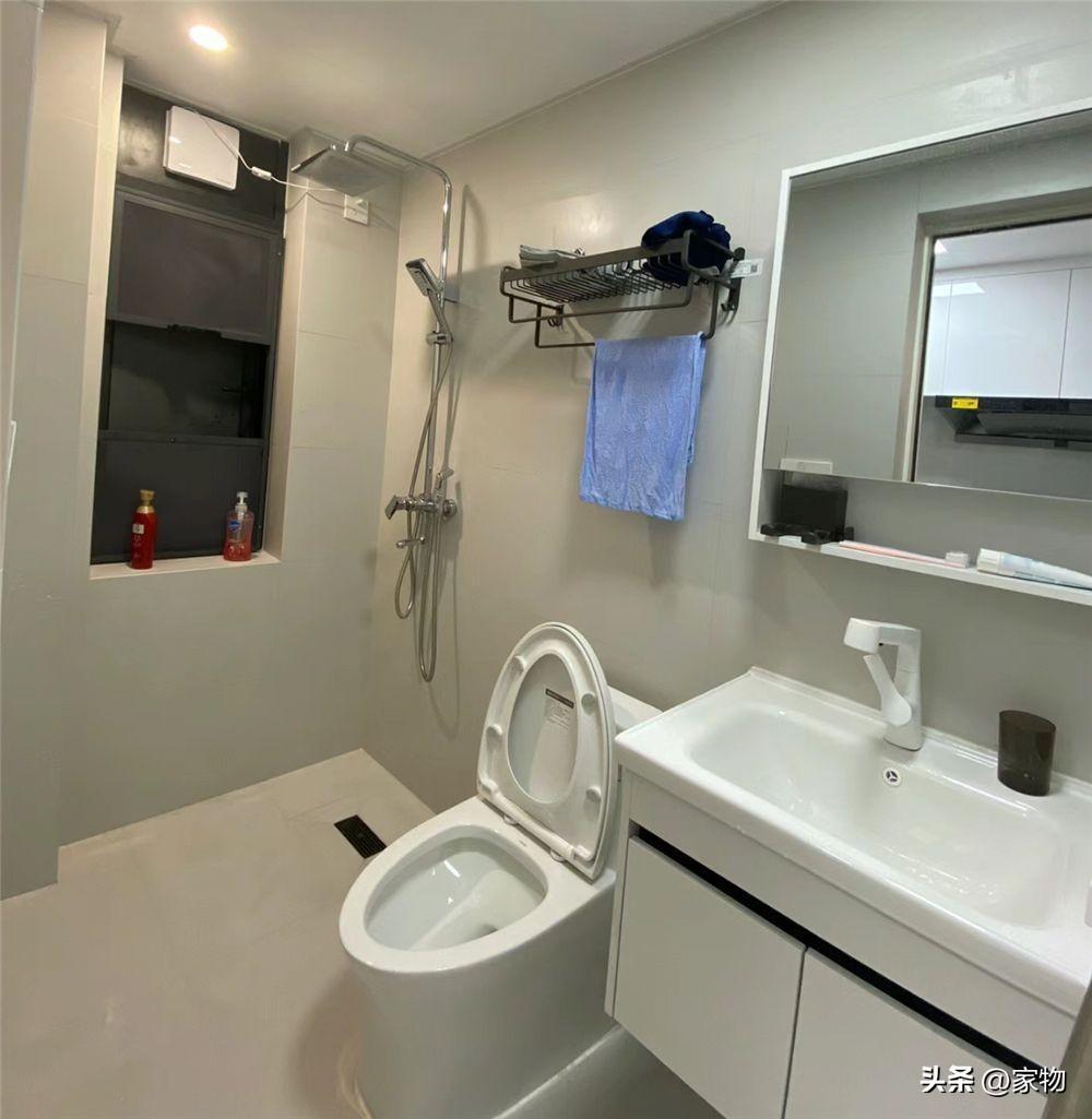 衛生間門開在廚房一側,中間是馬桶,靠窗位置做浴室,正對衛生間門的地方則做懸空浴室櫃,搭配鏡櫃做收納,可以收納下衛生間裏所有的清潔和洗漱用品,收納能力太強。