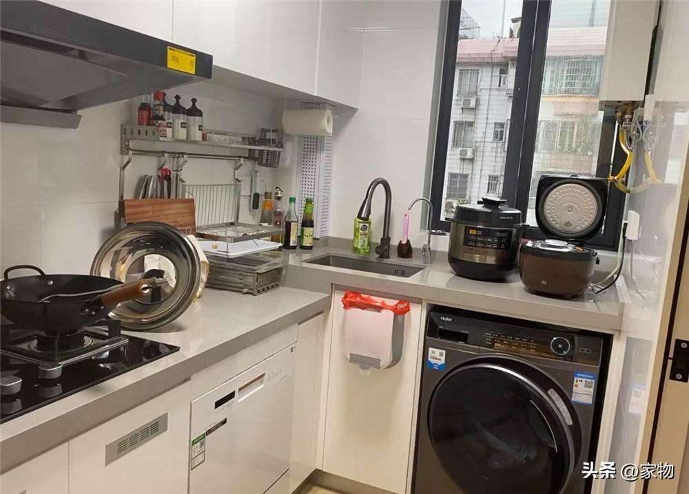 竈臺和水槽中間做了高低臺,洗碗炒菜都不累腰,洗衣機也嵌入廚房內,與水槽共用排水,其上放放小廚電同樣剛好合適。