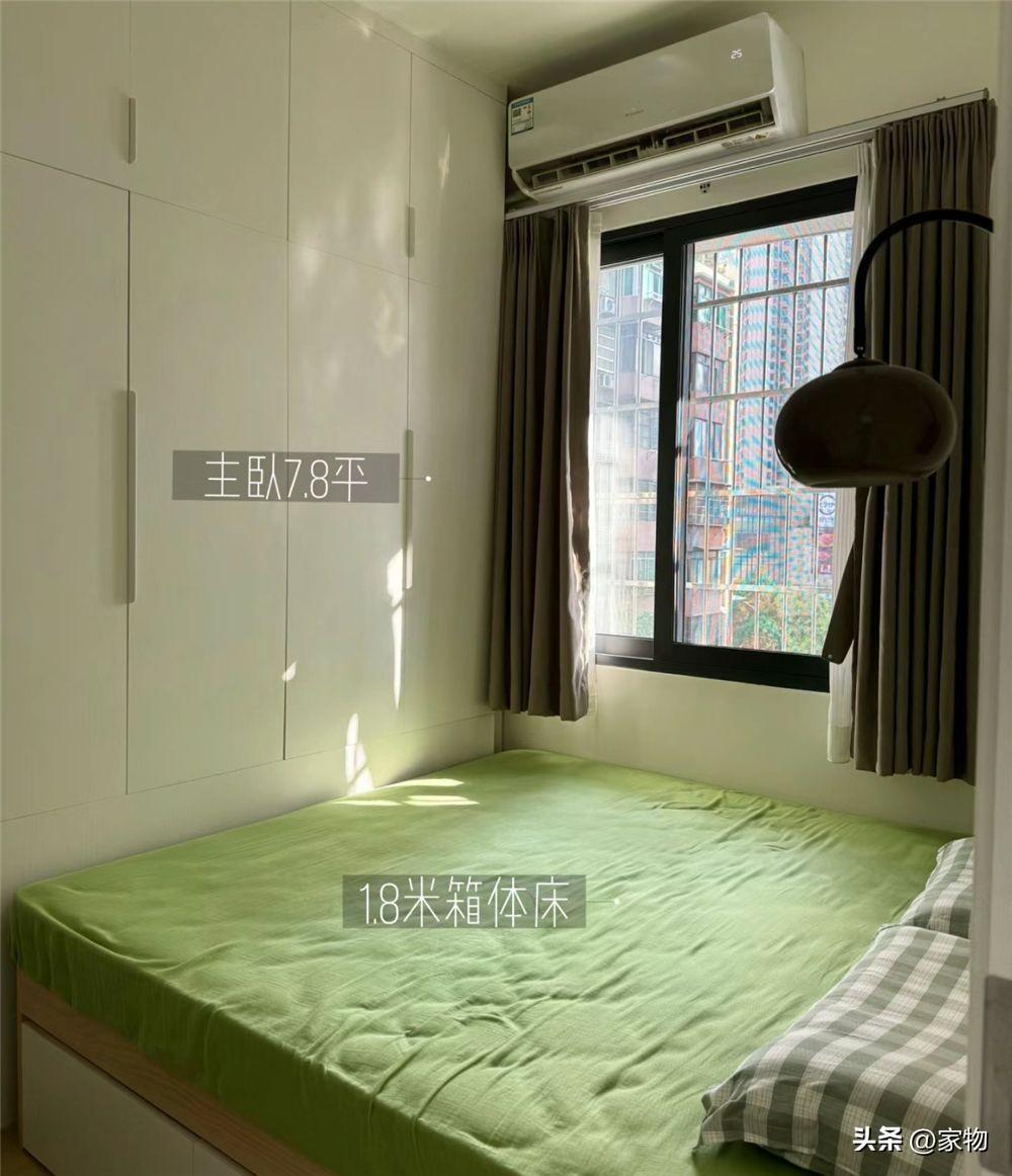 而主臥室呢,面積稍微大一點,有大概7.8㎡左右,一面牆做衣櫃進行收納,另一邊剛好避開門框,放下一張1.8米的箱體牀,睡眠尺寸更加寬敞,一個人住別提多舒適了。